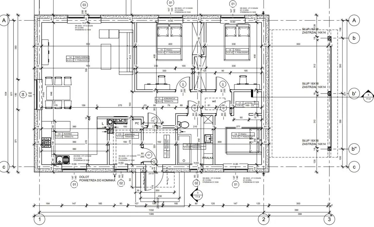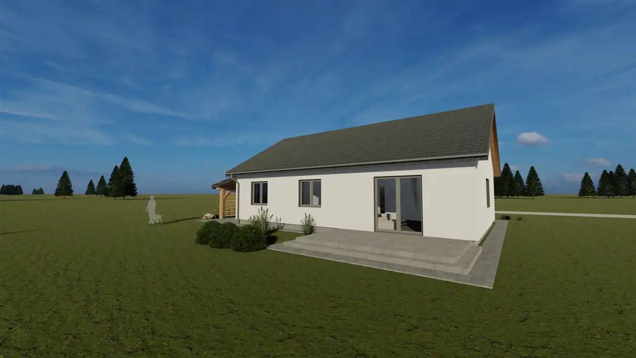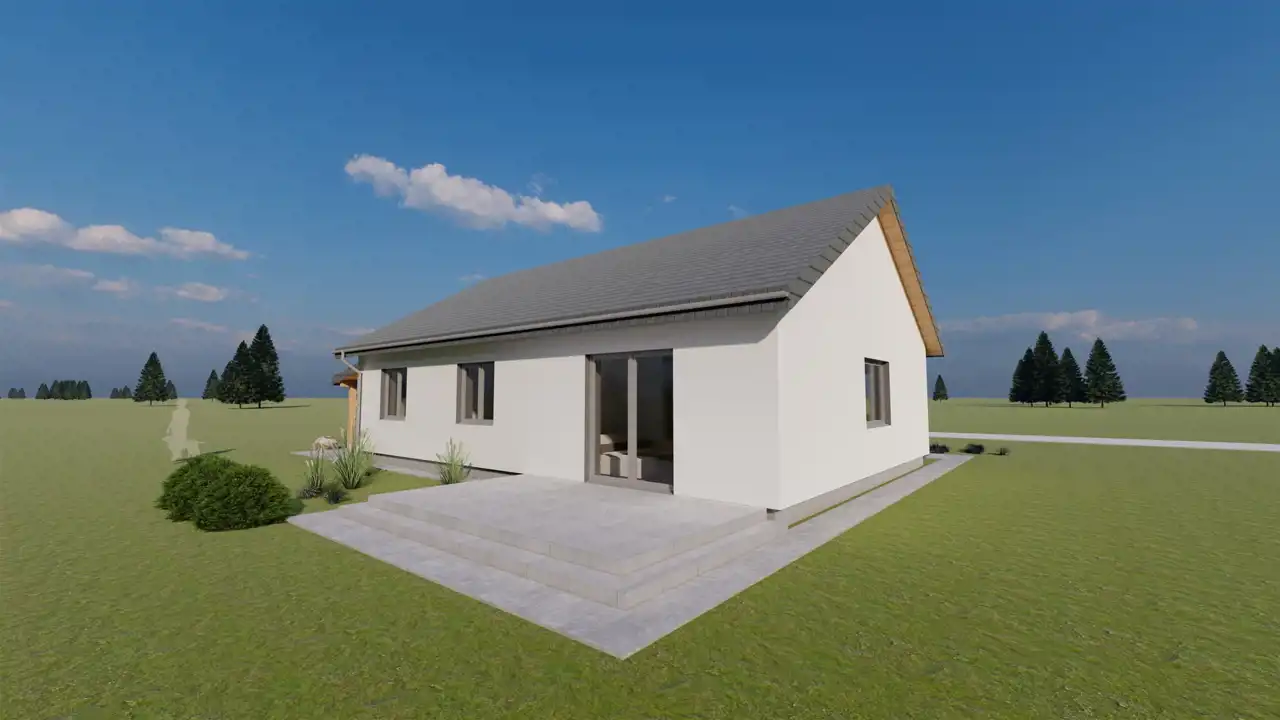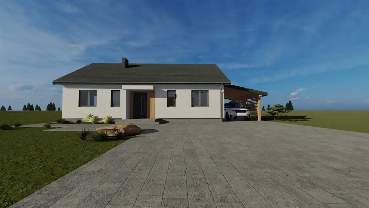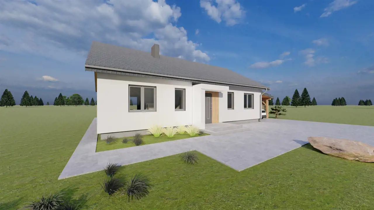 Ściany konstrukcyjne wybudowane będą z gazobetonu o grubości 24 cm na zaprawie cementowo - wapiennej o wytrzymałości 5 Mpa, który charakteryzuje się bardzo dobrą wytrzymałością, izolacyjnością cieplną i akustyczną, ocieplone zostaną styropianem o grubości 20 cm. Ściany fundamentowe szerokości 25 cm z bloczków betonowych M 15 klasy 15 na zaprawie cementowej marki 3 MPa. Elewacja budynku wykonana będzie z tynku mineralnego, pomalowana farbą silikonową i ozdobiona zostanie elementami imitującymi drewno. Ściany wewnętrzne działowe murowane będą z gazobetonu o grubości 12 cm oraz wykończone zostaną tynkiem maszynowo - gipsowym. Strych będzie ocieplony wełną mineralną grubości 25 cm, zostanie zamontowana konstrukcja lekka, płyta gipsowo - kartonowa. W budynku zamontowane zostaną energooszczędne trzyszybowe okna w kolorze antracyt z zewnątrz (w środku białe). W salonie z aneksem kuchennym będą wstawione drzwi tarasowe - przesuwne, które łączą dom z ogrodem w najbardziej komfortowy sposób. Rozwiązanie drzwi tarasowych rozświetla pomieszczenia, ułatwiają komunikację i otwierają przestrzeń. Konstrukcja dachu wielospadowego kopertowego konstrukcji prefabrykowanej o kącie nachylenia 30o będzie pokryta dachówką ceramiczną firmy Roben z myślą o nowoczesnej architekturze. W nieruchomości rozprowadzona zostanie po całym domu instalacja elektryczna oraz wodno - kanalizacyjna. W budynku położona będzie instalacja ogrzewania podłogowego, która będzie sterowana pompą ciepła firmy Atlantic MH ALFEA EXTENSA DUO A.I. 6-8 R 32.