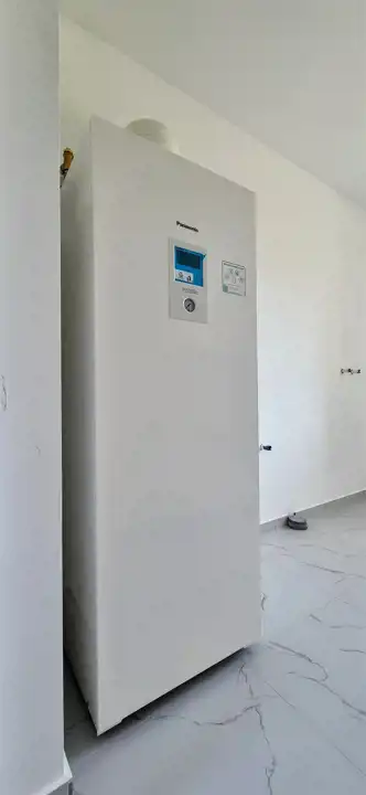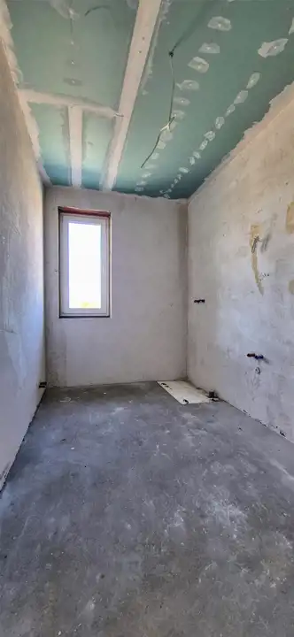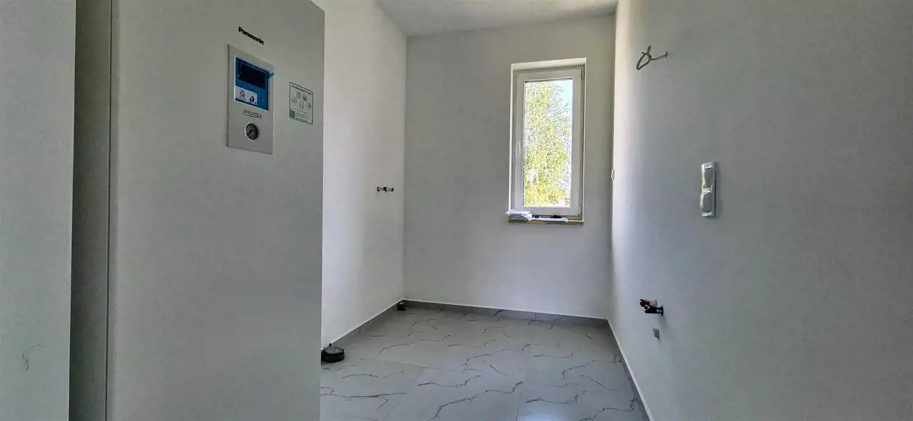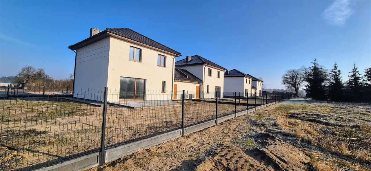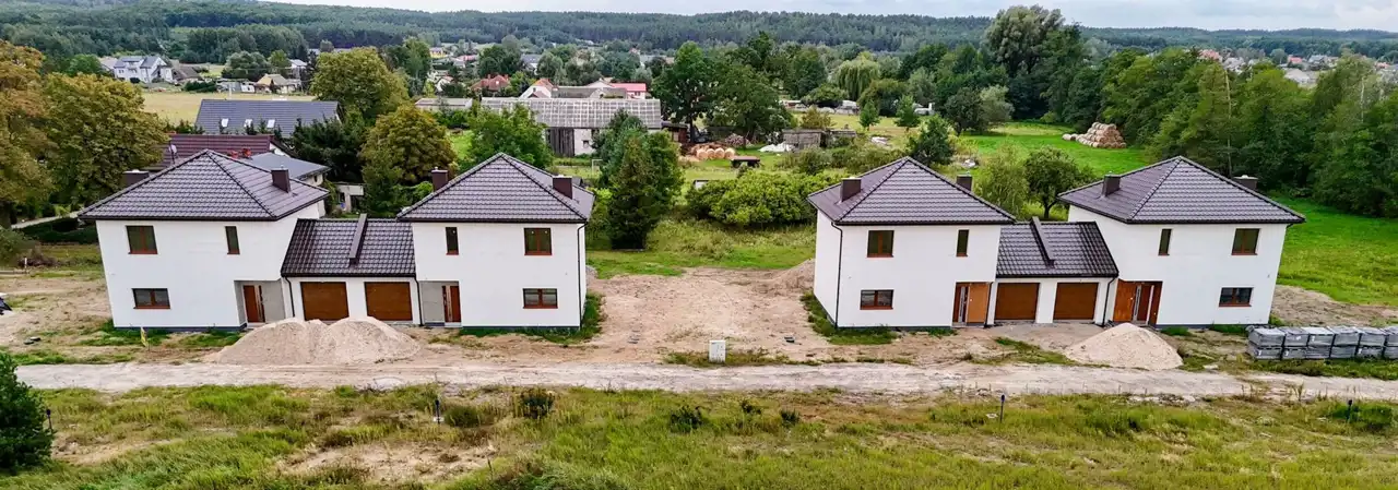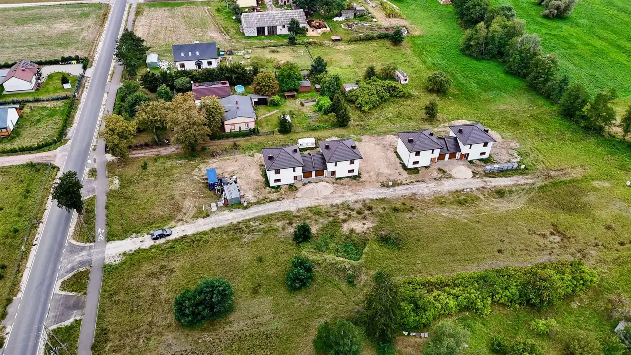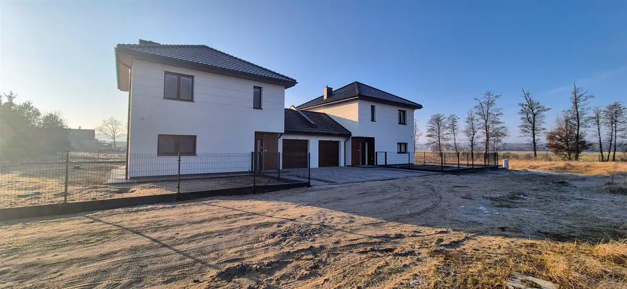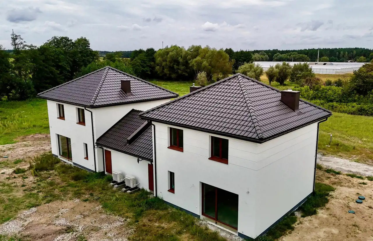 Ściany konstrukcyjne wybudowane zostały z bloczków komórkowych Suporex, który charakteryzuje się bardzo dobrą wytrzymałością, izolacyjnością cieplną i akustyczną, ocieplone zostały styropianem o grubości 20 cm. Elewacja budynku wykonana jest z tynku silikonowego i ozdobiona została elementami imitującymi drewno w kolorze orzech. Ściany wewnętrzne na parterze oraz poddaszu wykończone zostały tynkiem maszynowo - gipsowym przygotowanym pod malowanie. W kotłowni - łazience na podłodze położony jest gres w kolorze białym. Strych jest ocieplony wełną celulozową grubości 35 cm, która zapewnia wysoką izolacyjność termiczną. Zastosowano strop żelbetonowy prefabrykowany, a na poddaszu będzie wykonana konstrukcja lekka, płyta gipsowo - kartonowa. W budynku zamontowane zostały energooszczędne trzyszybowe okna w kolorze złoty dąb z certyfikatem ciepłego montażu. Konstrukcję dachu pokryto dachówką ceramiczną Roben Piemont w kolorze brązowym. Inwestor decydując się na szereg nowoczesnych rozwiązań technicznych i funkcjonalnych zadbał o oszczędność w utrzymaniu lokali przyszłym użytkownikom. W związku z tym rozprowadzona została po całym domu instalacja ogrzewania podłogowego, która będzie sterowana regulatorami w każdym pomieszczeniu firmy Tech (ST-294-V1) oraz zainstalowana jest pompa ciepła renomowanej firmy Panasonic Aquarea High Performance All-in-one WH -UD07JE5 (R32) klasa A++. Dodatkowo jest zamontowana stacja zmiękczania i uzdatniania wody firmy Viessmann. Podłączono również instalację elektryczną z osprzętem, telewizyjną oraz przydomową oczyszczalnię ścieków firmy GRAF epureco 2100 litrów. Rozwiązanie bliźniacze budynków pozwala na mniejsze zużycie ogrzewania, dzięki eliminacji elewacji bocznej, które w tym przypadku charakteryzuje się wykonaniem dwuwarstwowej ściany ze styropianem. Ściana ta świetnie izoluje akustyczność zapewniając przy tym ciszę i spokój we wnętrzu, oddzielając przy tym segmenty dwóch domów. Taras oraz podjazd do garażu został wyłożony nowoczesną kostką brukową firmy Semmelrock. Nieruchomość ogrodzona jest z nowoczesnych paneli modułowych. Brama garażowa firmy Wiśniowski jest zamontowana wraz z automatyką. W lokalu jest zamontowana instalacja alarmowa oraz pod monitoring pod względem bezpieczeństwa przyszłych właścicieli nieruchomości. Dodatkowo we wszystkich oknach zostały zamontowane antywłamaniowe rolety zewnętrzne z napędem elektrycznym, sterowane na pilota.