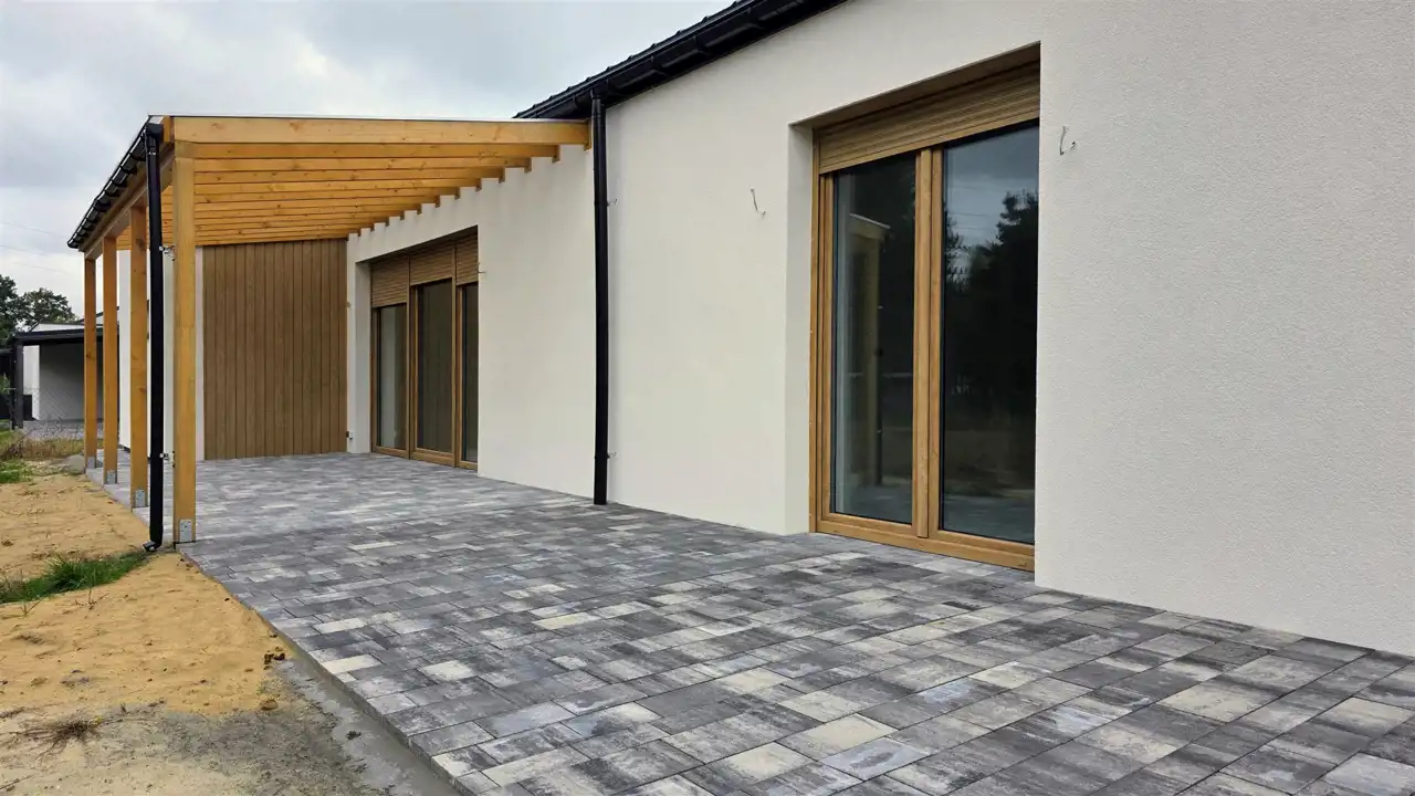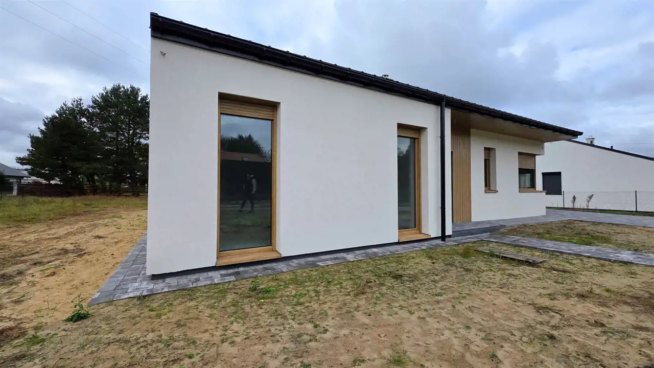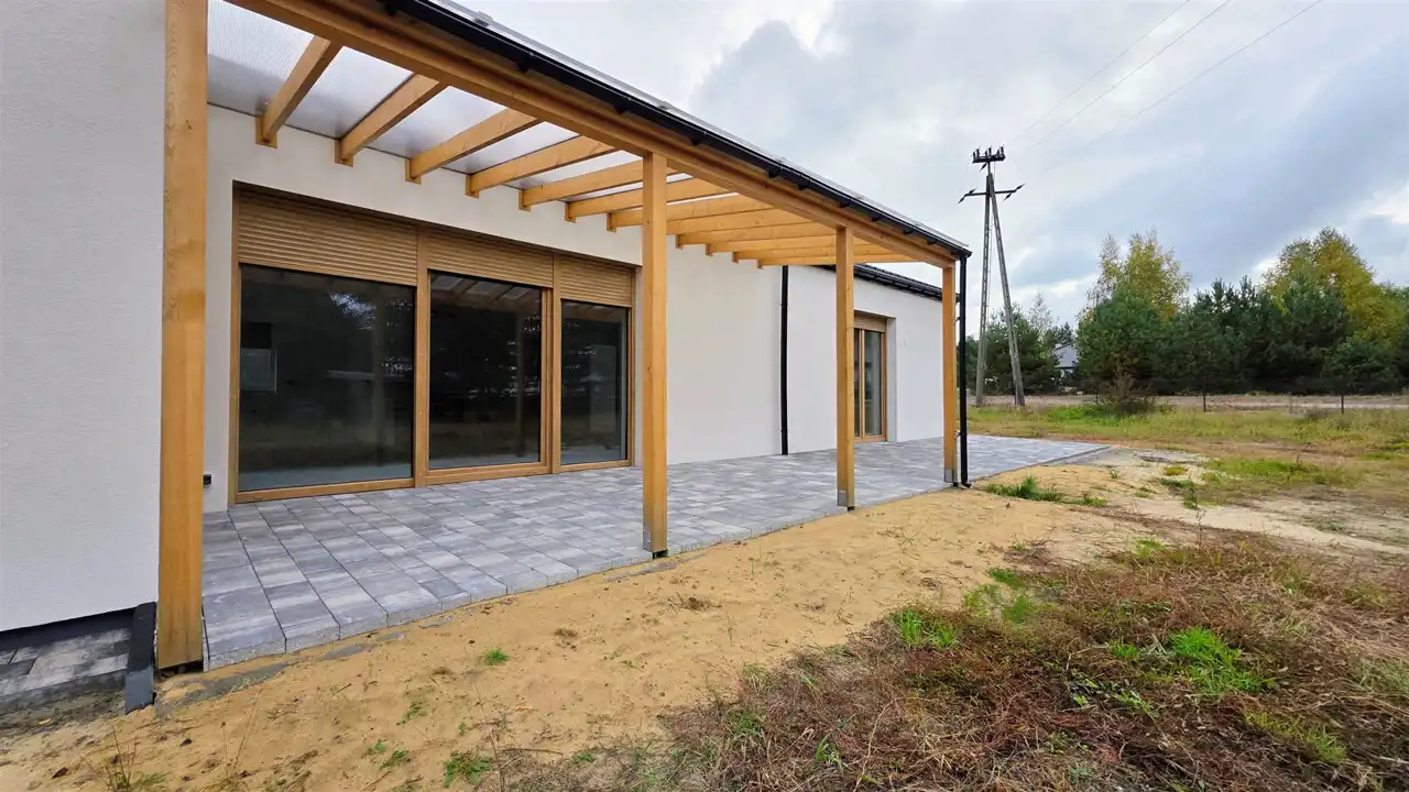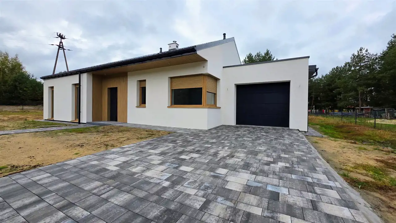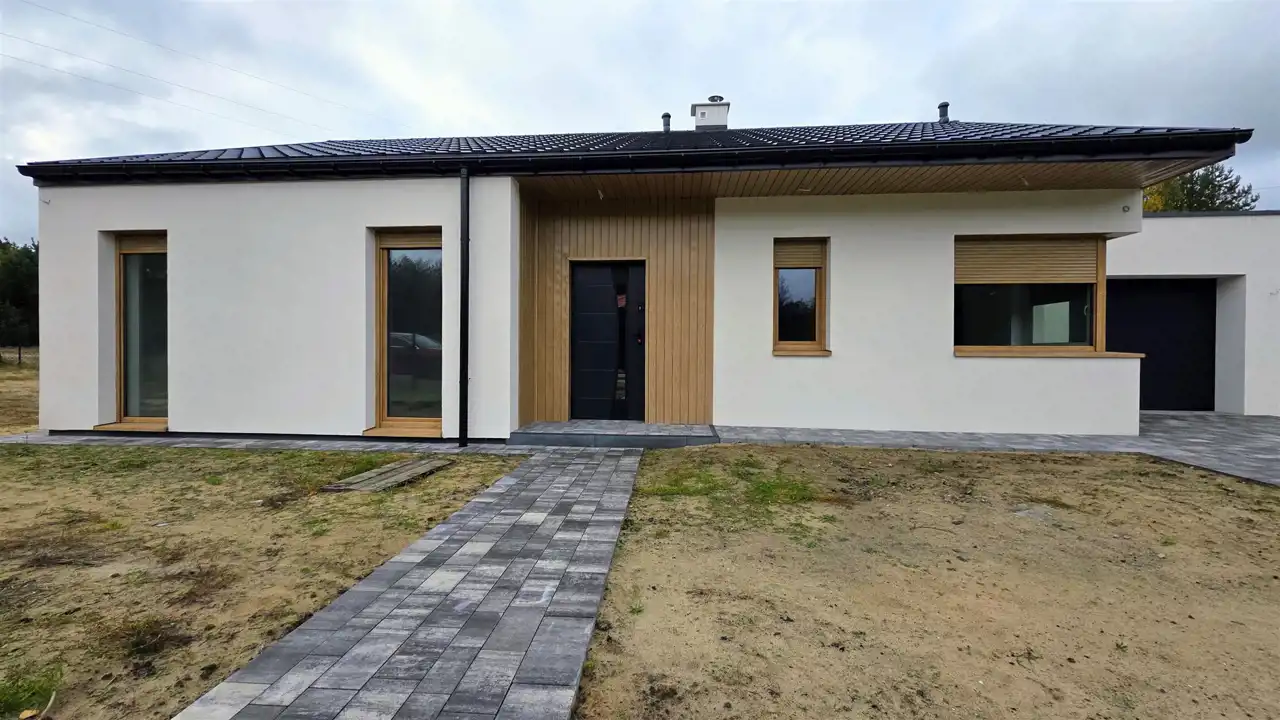 Ściany konstrukcyjne zostały wybudowane z gazobetonu grubości, który charakteryzuje się bardzo dobrą wytrzymałością, izolacyjnością cieplną i akustyczną, ocieplony styropianem o grubości 20 cm. Elewacja budynku została pomalowana białą farbą silikonową. Ściany wewnętrzne na parterze wykończone tynkiem maszynowo - gipsowym, na których położona gładź została pomalowana białą farbą. Strych jest ocieplony wełną mineralną grubości 30 cm, zamontowana konstrukcja lekka, płyta gipsowo - kartonowa. Do oświetlenia nieruchomości wykorzystano nowoczesne sufity napinane, które można podświetlić oświetleniem LED. W budynku zamontowane energooszczędne trzyszybowe okna w kolorze drewna z zewnątrz (w środku białe) oraz antywłamaniowe rolety zewnętrzne w każdym pomieszczeniu. Konstrukcja dachu pokryta blachodachówką. W nieruchomości rozprowadzona została po całym domu instalacja ogrzewania podłogowego, instalacja elektryczna oraz wody i kanalizacji. W salonie zamontowano kominek NORDflam, który ma bardzo duże zalety jako cecha ogrzewania: wszechstronność, efektywność, oszczędność i ekologię. Ogrzewanie podłogowe będzie sterowane dwufunkcyjnym piecem gazowym firmy Beretta z podgrzewaczem ciepłej wody. Taras oraz podjazd do garażu został wyłożony kostka brukową renomowanej firmy Semmelrock. Dodatkowo na tarasie zamontowano zadaszenie z poliwęglanu.
