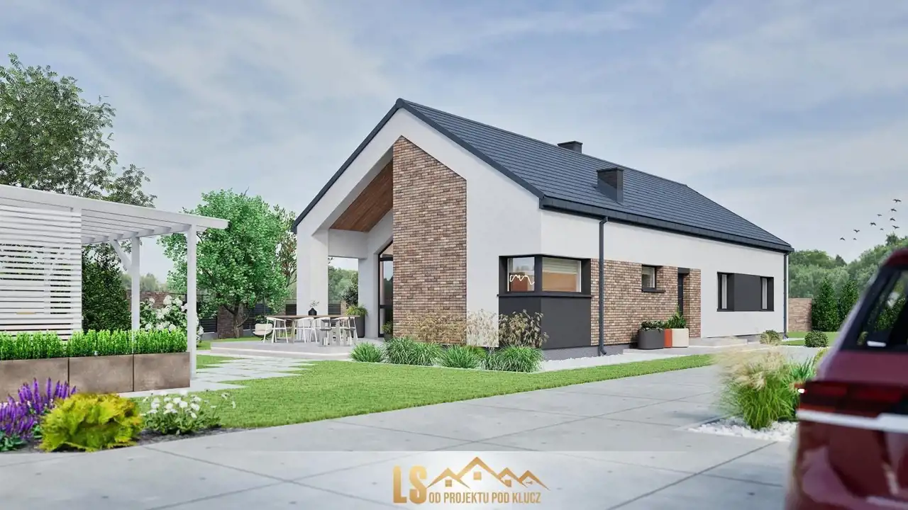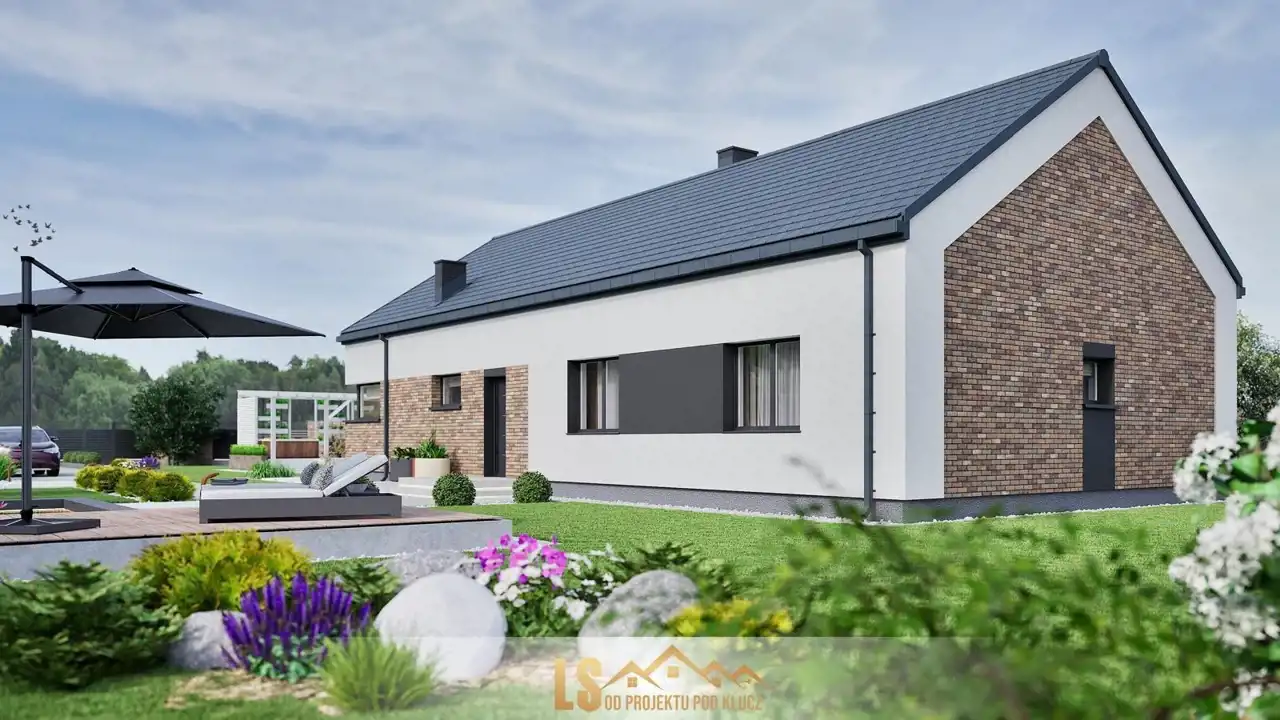 Zamontowane okna do sufitu to nowoczesne, pełnowymiarowe przeszklenia sięgające od podłogi aż po sufit. Zapewniają maksymalne doświetlenie wnętrz i optycznie powiększają przestrzeń nieruchomości. Stanowią element luksusu i nowoczesności. Ściany konstrukcyjne wybudowane będą z keramzytu o grubości 24 cm który charakteryzuje się bardzo dobrą wytrzymałością, izolacyjnością cieplną i akustyczną, ocieplone zostaną styropianem o grubości 20 cm. Elewacja budynku wykonana będzie z tynku mineralnego, pomalowana farbą silikonową i ozdobiona zostanie elementami imitującymi drewno oraz beton architektoniczny. Ściany wewnętrzne na parterze wykończone zostaną tynkiem maszynowo - gipsowym. Strych będzie ocieplony wełną mineralną grubości 25 cm, zostanie zamontowana konstrukcja lekka, płyta gipsowo - kartonowa. Konstrukcja dachu skośnego będzie pokryta innowacyjną dachówką betonową firmy Creaton z myślą o nowoczesnej architekturze. W nieruchomości rozprowadzona zostanie po całym domu instalacja elektryczna, wody i kanalizacji. W budynku położona będzie instalacja ogrzewania podłogowego, która będzie sterowana pompą ciepła firmy Atlantic.