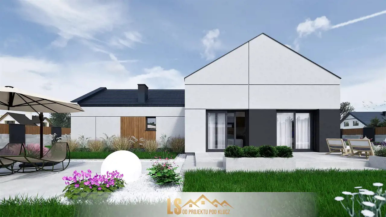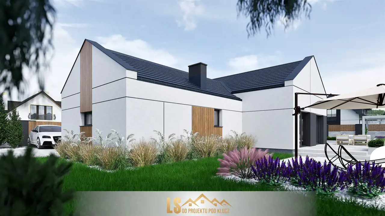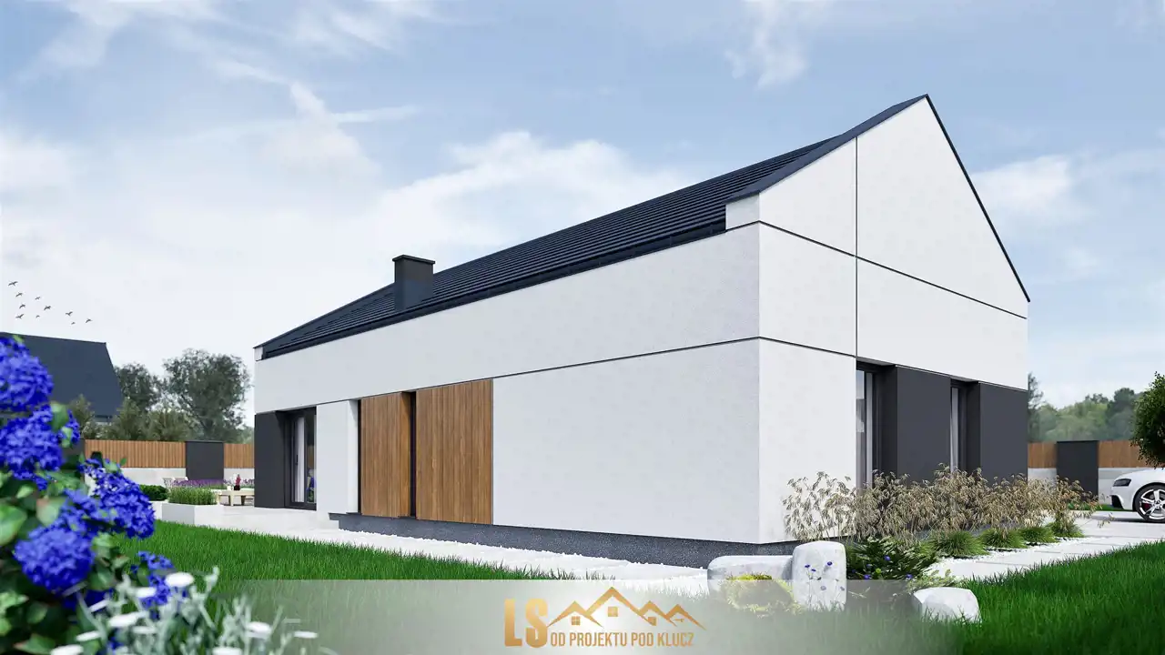 Ściany konstrukcyjne wybudowane będą z keramzytu o grubości 24 cm który charakteryzuje się bardzo dobrą wytrzymałością, izolacyjnością cieplną i akustyczną, ocieplone zostaną styropianem o grubości 20 cm. Elewacja budynku wykonana będzie z tynku mineralnego, pomalowana farbą silikonową i ozdobiona zostanie elementami imitującymi drewno oraz beton architektoniczny. Ściany wewnętrzne na parterze wykończone zostaną tynkiem maszynowo - gipsowym. Strych będzie ocieplony wełną mineralną grubości 25 cm, zostanie zamontowana konstrukcja lekka, płyta gipsowo - kartonowa. W budynku zamontowane zostaną energooszczędne trzyszybowe okna w kolorze do wyboru z zewnątrz (w środku białe). Konstrukcję dachu dwuspadkowego będzie pokryta innowacyjną dachówką betonową firmy Creaton z myślą o nowoczesnej architekturze. W nieruchomości rozprowadzona zostanie po całym domu instalacja elektryczna, wody i kanalizacji. W budynku położona będzie instalacja ogrzewania podłogowego, która będzie sterowana pompą ciepła firmy Atlantic.