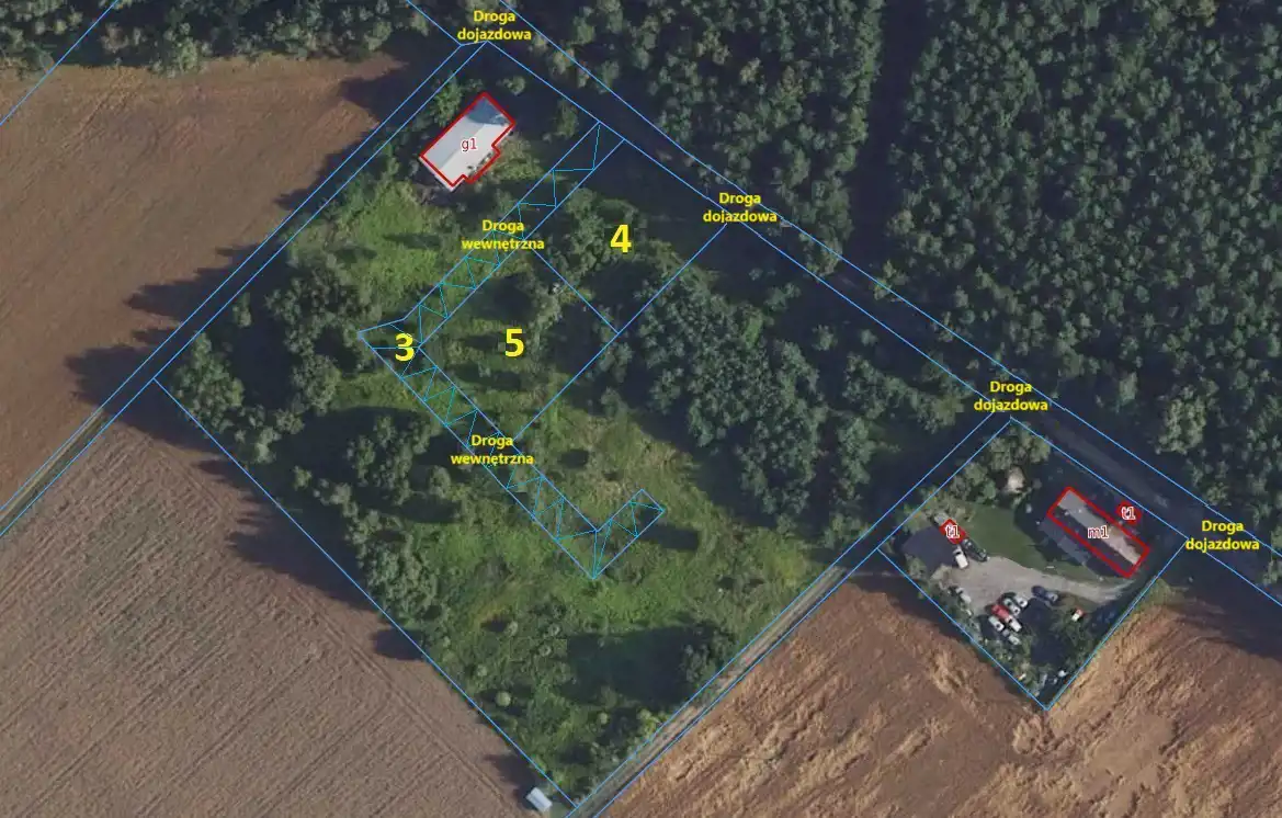 Działka nr 3 - stanowi wewnętrzną drogę dojazdową, w której nabywcy sprzedawanych działek nr 4 i 5 nabędą udziały. Koszt nabycia udziałów w drodze dojazdowej wynosi 2 500 złotych. Istnieje również możliwość zakupu całego gruntu, włącznie ze wszystkimi działkami.