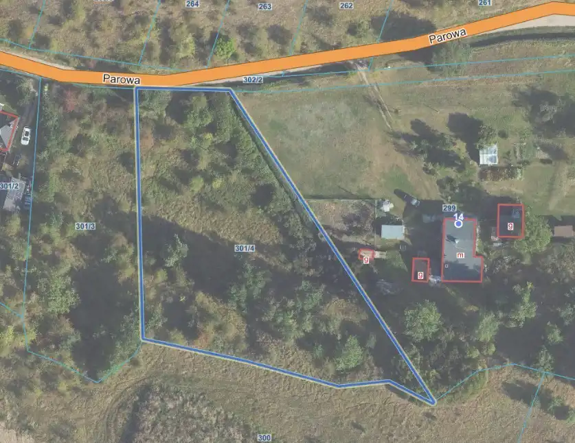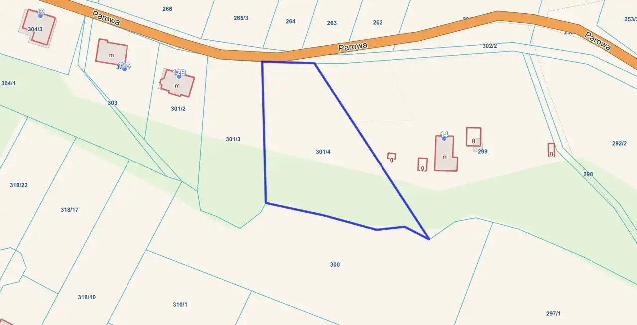 Działka ma nieregularny kształt, jest dobrze nasłoneczniona i posiada dostęp do drogi publicznej – znajduje się bezpośrednio przy ulicy Parowej.
