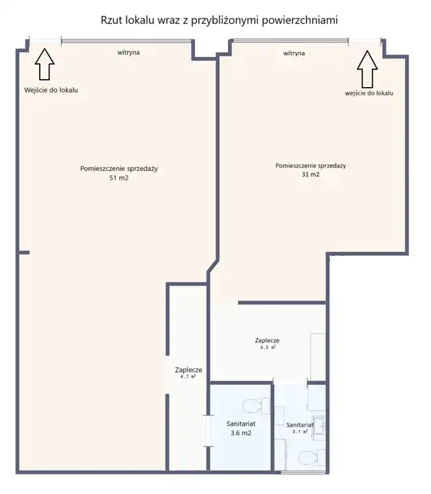 Powierzchnia pierwszego lokalu wynosi w przybliżeniu 40,30 m2, na którą składają się: pomieszczenie sprzedaży (około 31,00 m2), korytarz (zaplecze) oraz sanitariat. Drugi lokal o powierzchni 60,30 m2 natomiast składa się z pomieszczenia sprzedaży (około 51,00 m2), zaplecza oraz sanitariatu. Istnieje możliwość zburzenia ściany dzielącej wyodrębnione lokale, celem stworzenia jednego lokalu o powierzchni 100,60 m2. Witryny nieruchomości skierowane są w stronę północno-wschodnią.
