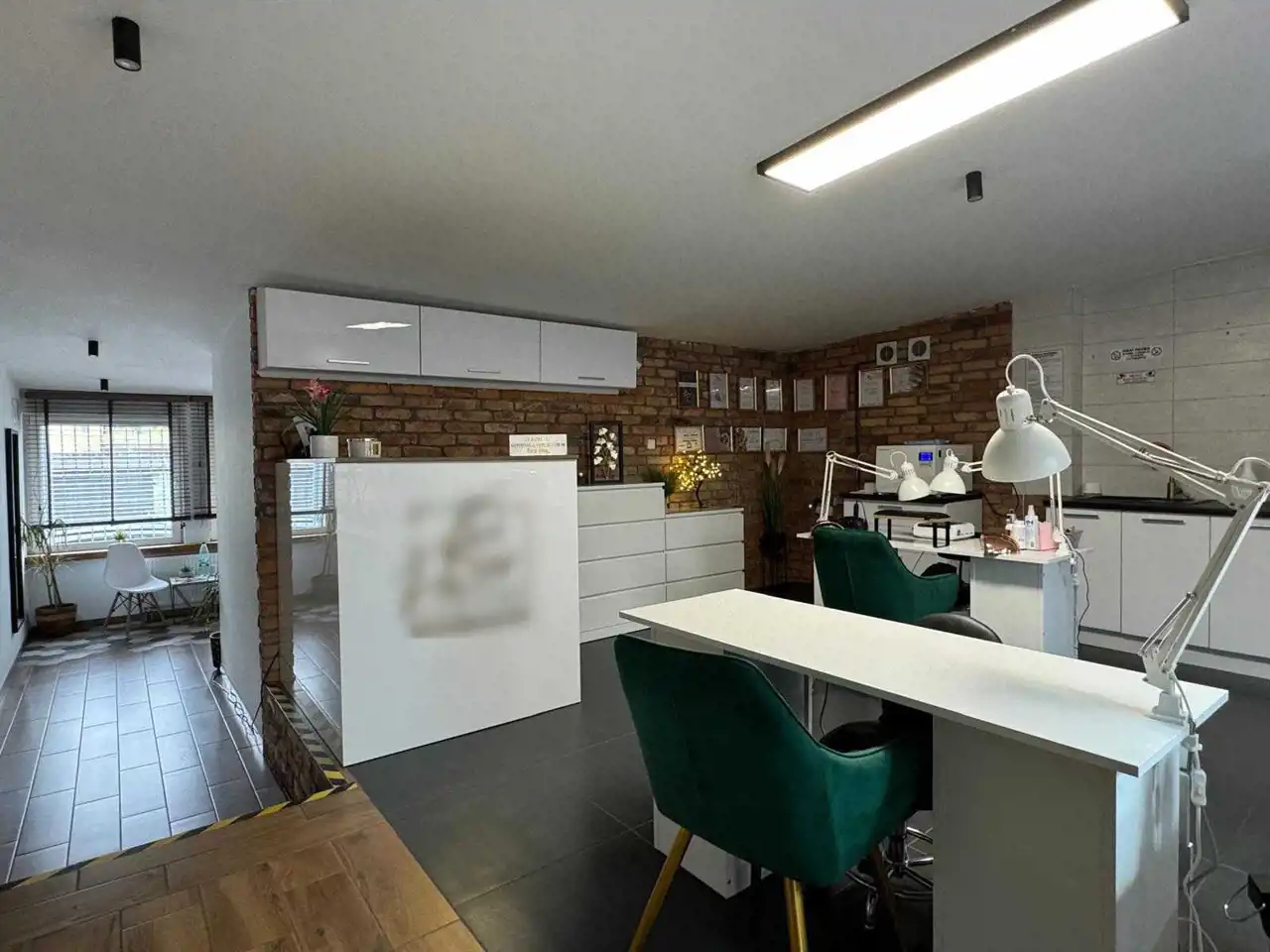 Wnętrze lokalu zostało gustownie wykończone, łącząc ze sobą funkcjonalność i styl. Ciemna podłoga w kolorze dębu oraz czarne kafle w pomieszczeniu sprzedaży współgrają ze ścianami częściowo pokrytymi ozdobnym kamieniem imitującym cegłę, częściowo białą farbą, tworząc w ten sposób przyjemną dla oka i estetyczną kombinację. Rozmieszczenie poszczególnych pomieszczeń zapewnia świetną, dużą przestrzeń gotową do zaaranżowania.