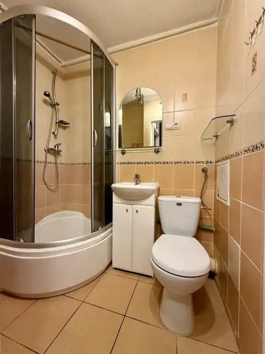 Łazienka – z prysznicem, toaletą i umywalką.