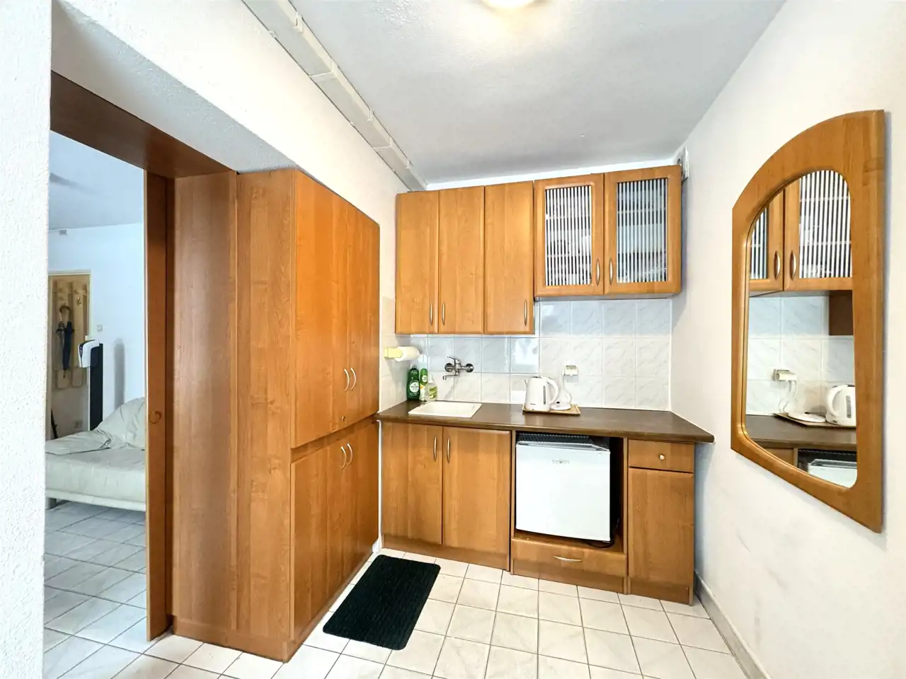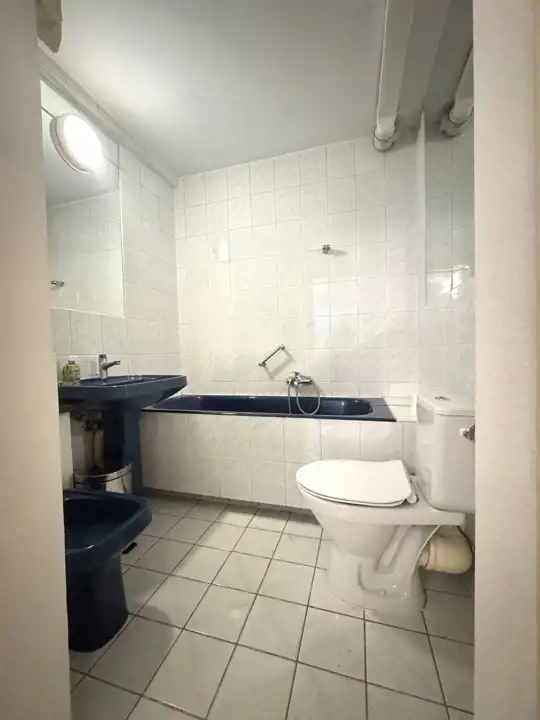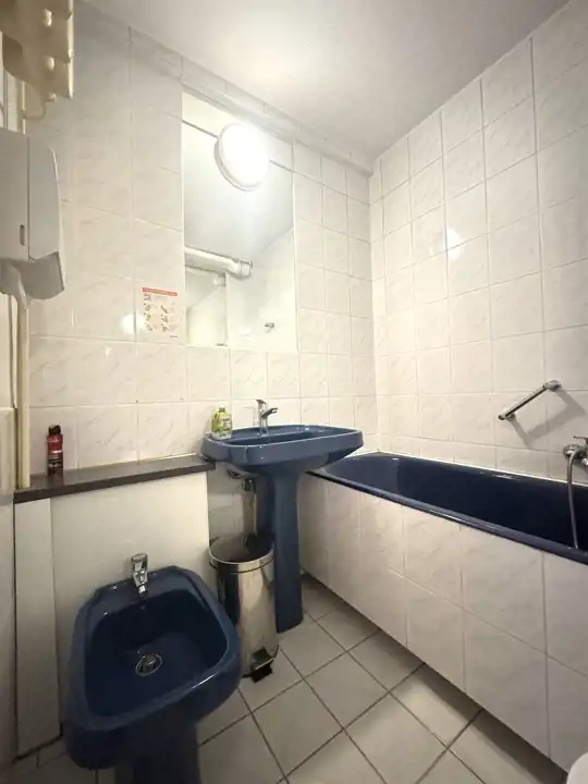 Kuchnię wyposażono w meble kuchenne w kolorze drewna. Łazienkę wyposażono w wannę, umywalkę, wc, oraz bidet.