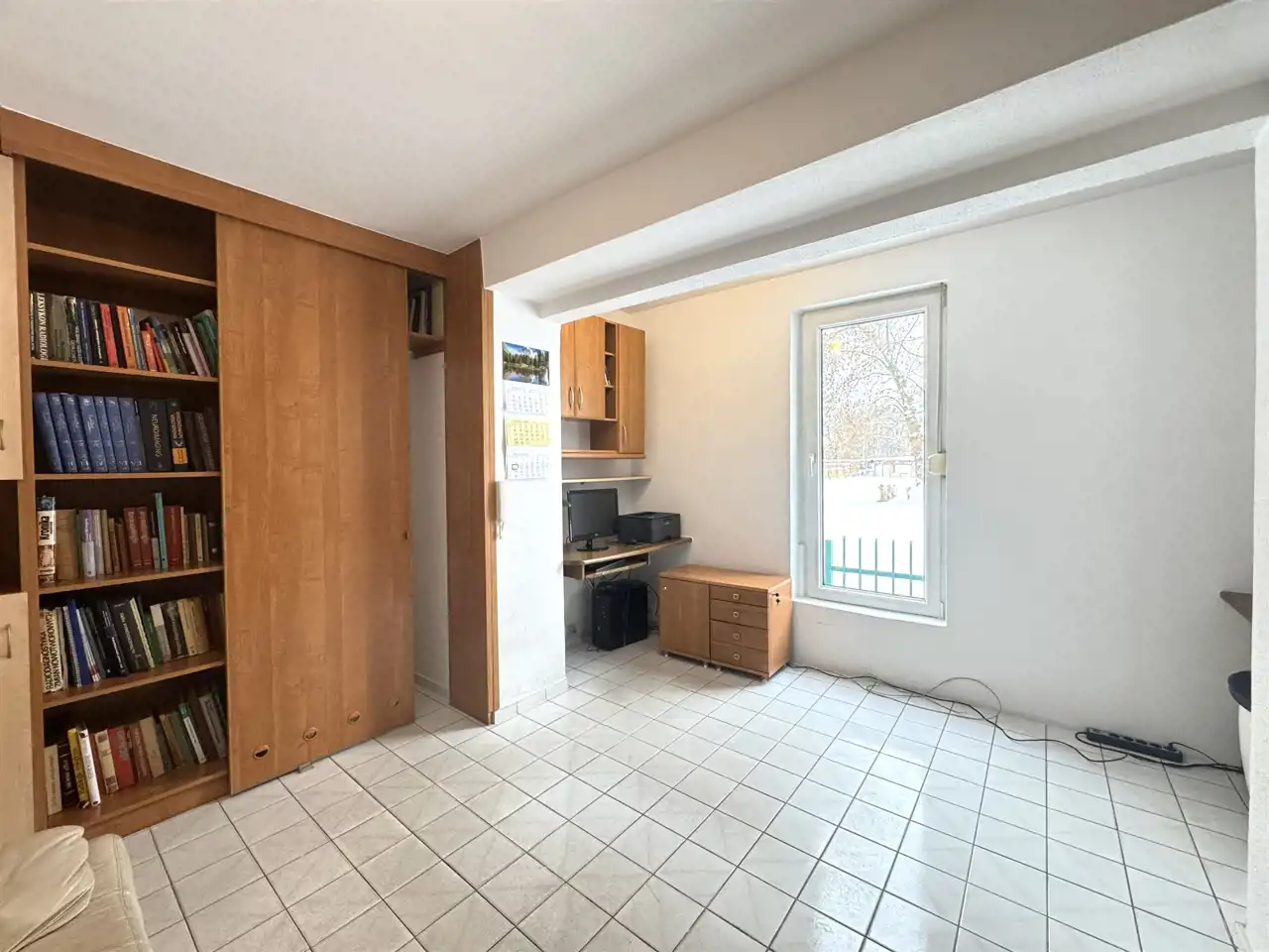 Salon został powiększony o powierzchnię balkonu, który został zabudowany ścianą z trzema oknami wyposażonymi w rolety zewnętrzne.