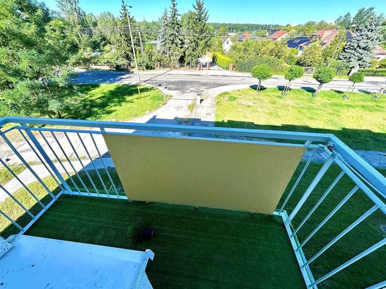 -Balkon z widokiem na zieloną przestrzeń.