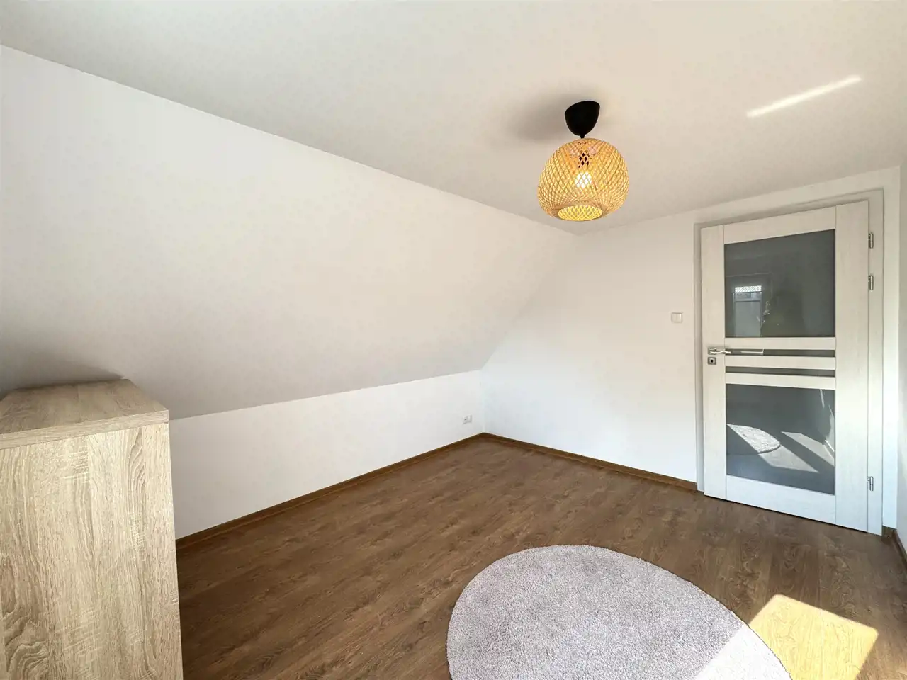 Mieszkanie przeszło po zakupie generalny remont. Na podłogach w pokojach położone zostały panele podłogowe, natomiast w kuchni przedpokoju oraz łazience zostały ułożone płytki imitujące panele kolorystycznie dobrane do paneli ułożonych w pokojach. Ściany pokryto gładzią i pomalowano farbą w białym kolorze, na jednej ścianie w salonie została położona ozdobna tapeta. Kuchnia została wyposażona w meble kuchenne oraz niezbędny sprzęt AGD: kuchenkę gazową z piekarnikiem elektrycznym. Nowoczesna łazienka pokryta została częściowo białymi kaflami oraz wyposażona w nowoczesną szklaną kabinę prysznicową, szafkę ze zlewem, wc oraz podświetlane lustro. Z łazienki jest przejście do dodatkowego pomieszczenia wygospodarowanego ze strychu, pokrytego drewnianymi płytami OSB, służącego jako duża garderoba. Do ogrzewania nieruchomości oraz wody wykorzystuje się nowoczesnym piec gazowy dwufunkcyjny.