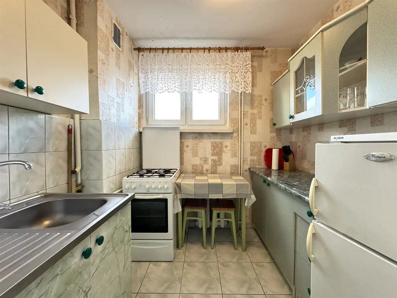 Mieszkanie jest ciche, ciepłe i słoneczne. Ściany w pokojach pokryto tapetami, natomiast na podłogach ułożono panele podłogowe. W kuchni na ścianach położono do połowy kafle, a od połowy tapety, na podłogach ułożono kafle. Kuchnię wyposażono w meble kuchenne oraz niezbędny sprzęt AGD: lodówko-zamrażarką, kuchenkę gazową z piekarnikiem elektrycznym. Łazienka pokryta została jasnymi kaflami i wyposażona została w kabinę prysznicową z brodzikiem, umywalkę z szafką, lustro, pralkę oraz wc.