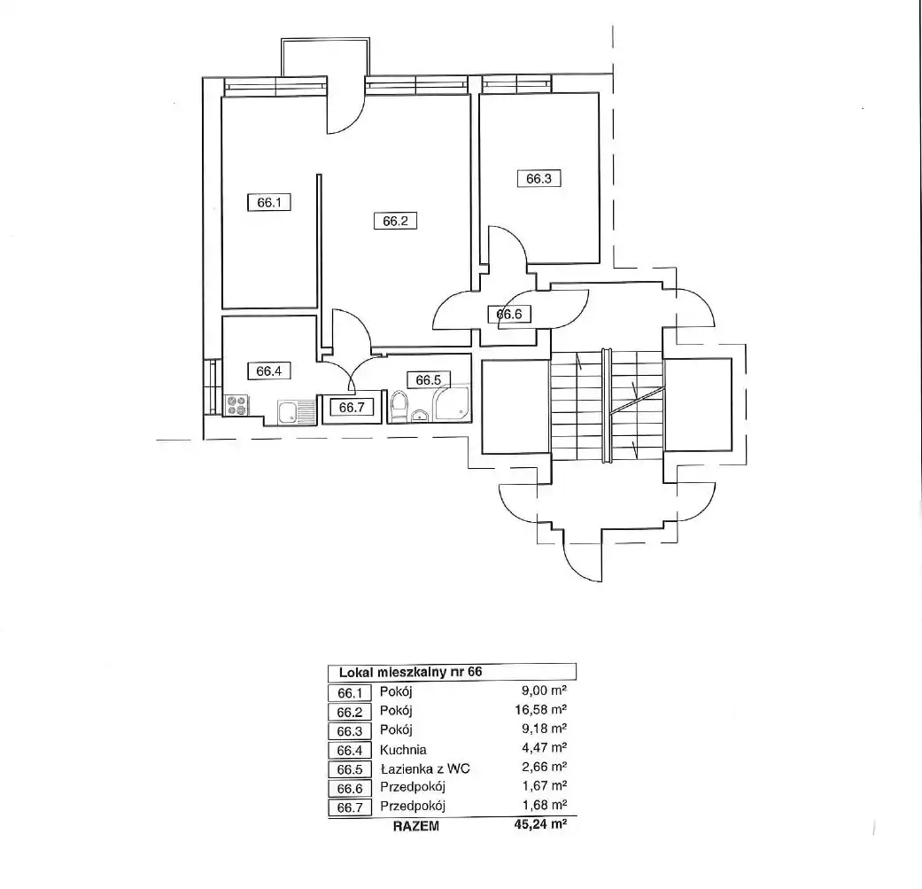 - Charakterystyka mieszkania 45.24 m2, 3 pokoje