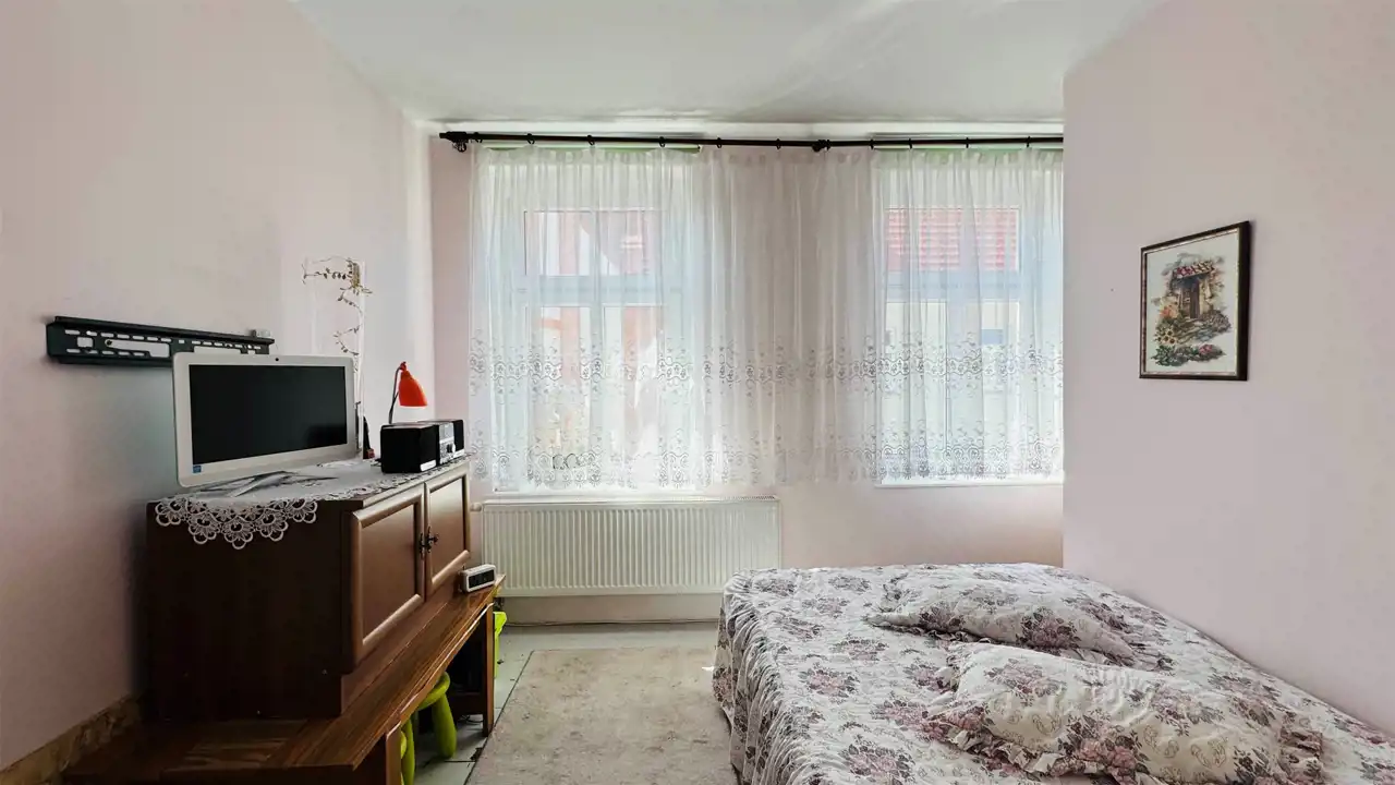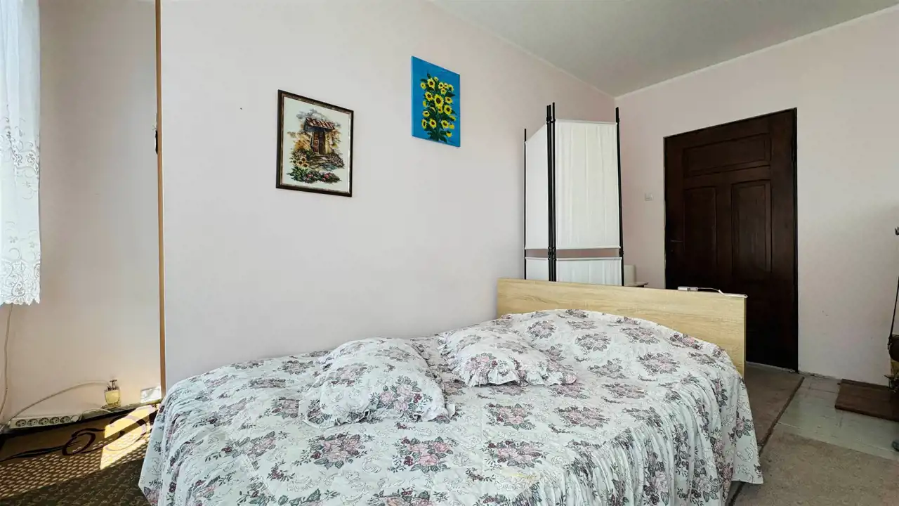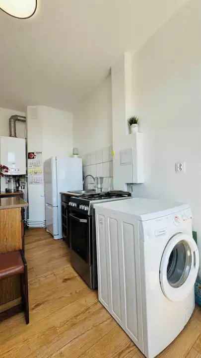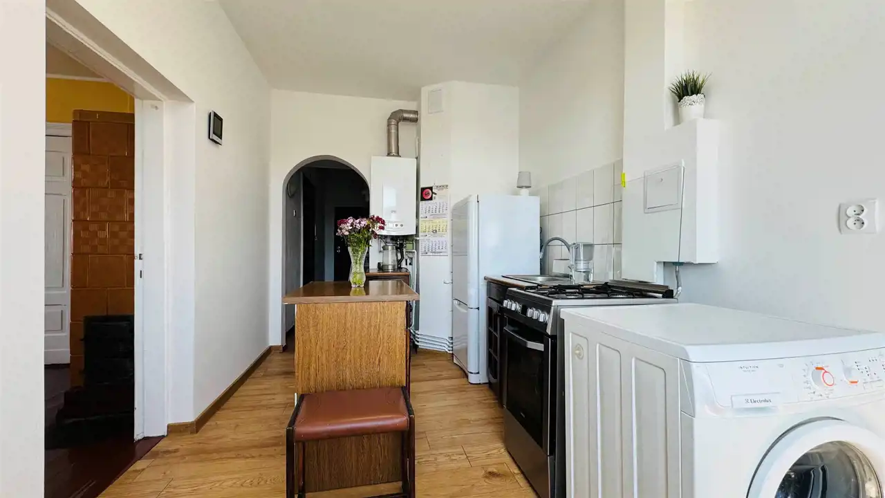 Widna kuchnia została wyposażona w sprzęt: piekarnik elektryczny wraz z płytą gazową, lodówko-zamrażarkę oraz pralkę. W pokoju dziennym pozostał dodatkowy piec kaflowy, gwarantujący dodatkowe źródło ogrzewania. Duża sypialnia została przedzielona ścianą działową, dając w ten sposób przestrzeń na garderobę (istnieje możliwość rozbicia ściany). Podłogę pomieszczeń stanowi drewno, panele drewniane oraz płytki (łazienka), natomiast ściany zostały pokryte farbą.