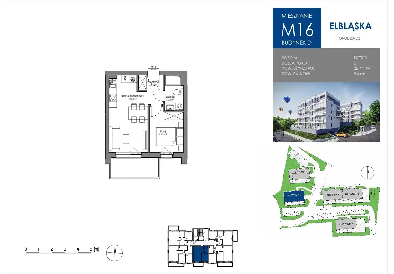 Biuro nieruchomości BAJ HOME oferuje Państwu w sprzedaży nowoczesne mieszkanie o powierzchni 32,44 m2, które umiejscowione będzie na efektownie usytuowanym osiedlu pod nazwą Wzgórza Tarpno, zlokalizowane przy ul. Elbląskiej w Grudziądzu. Dwupokojowe mieszkanie znajdować się będzie na 2 piętrze budynku D.