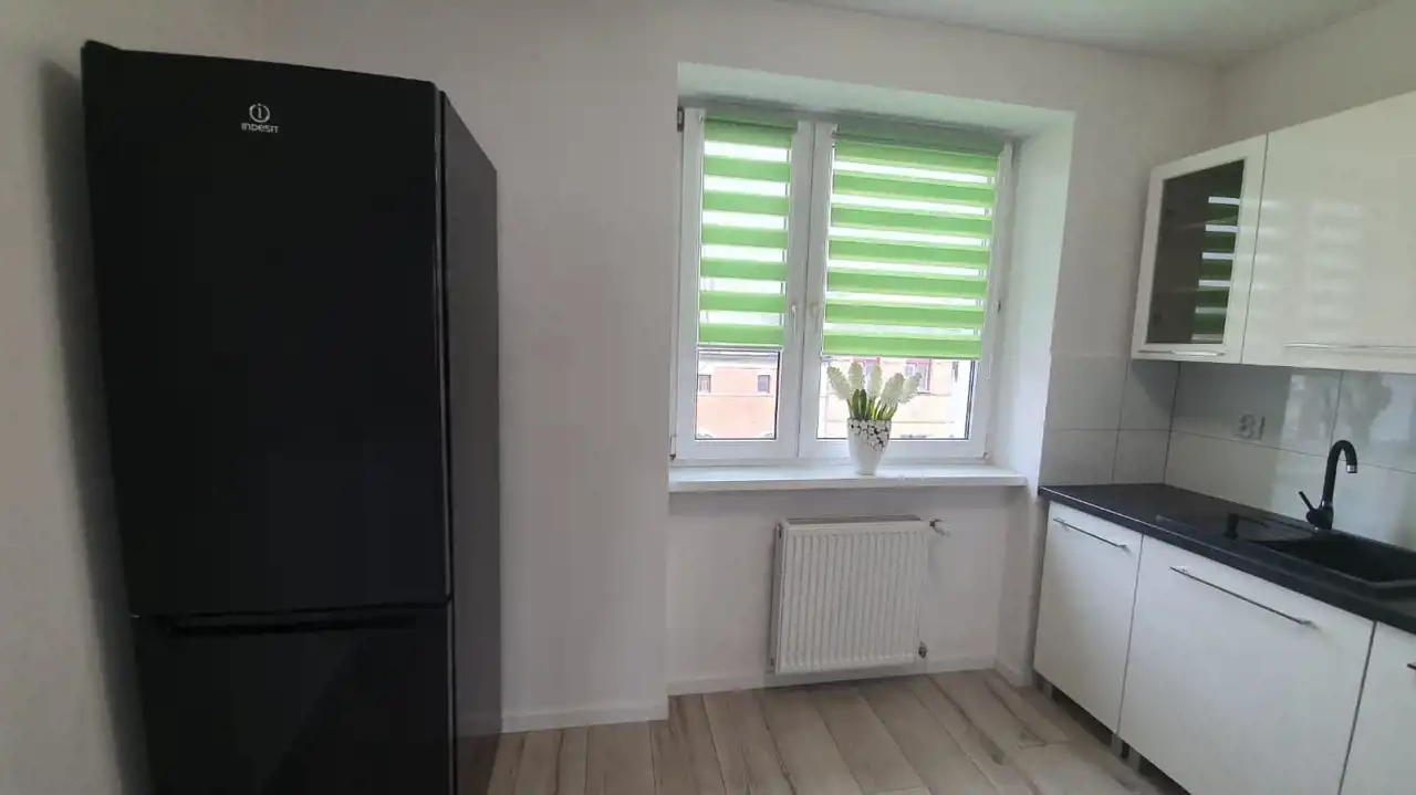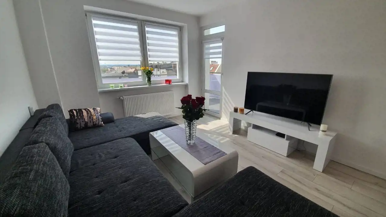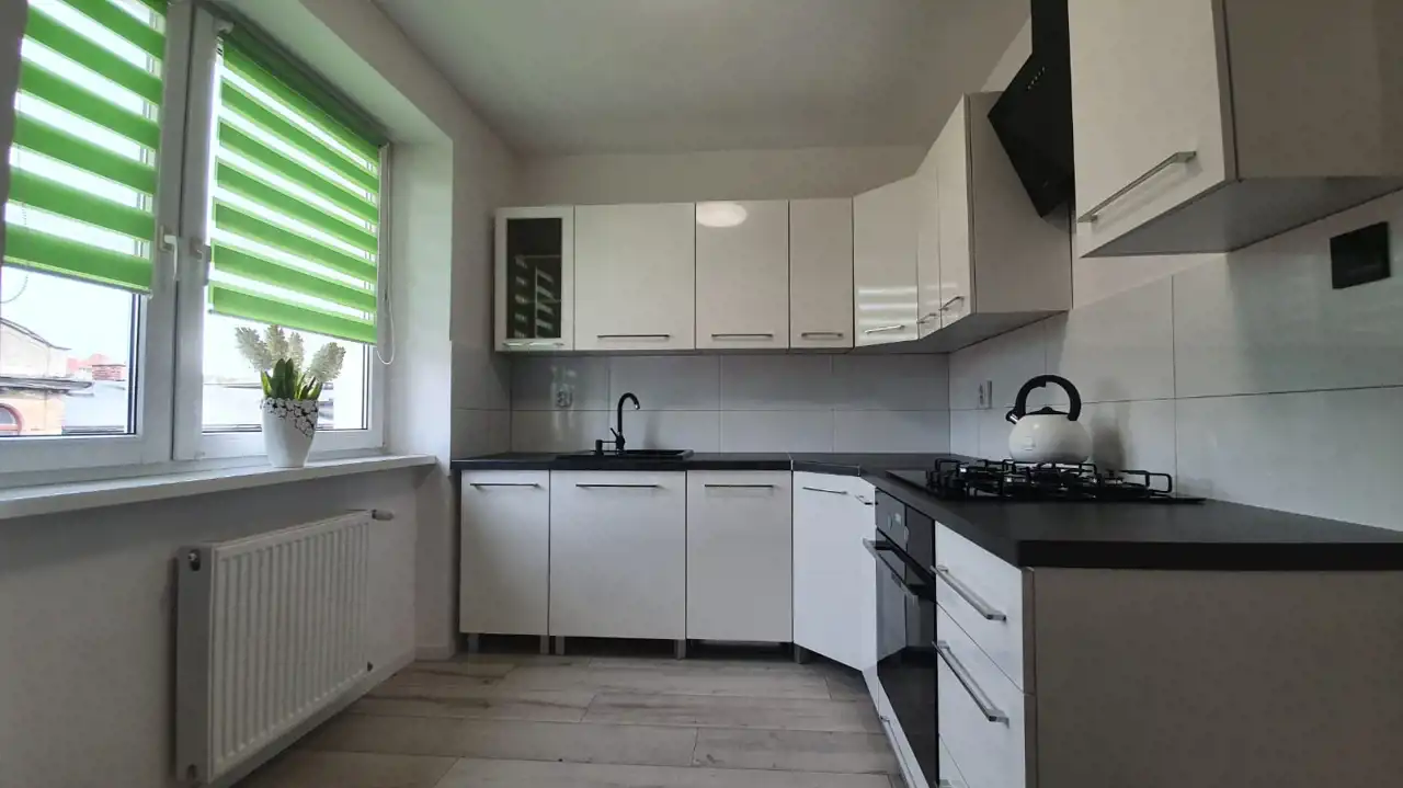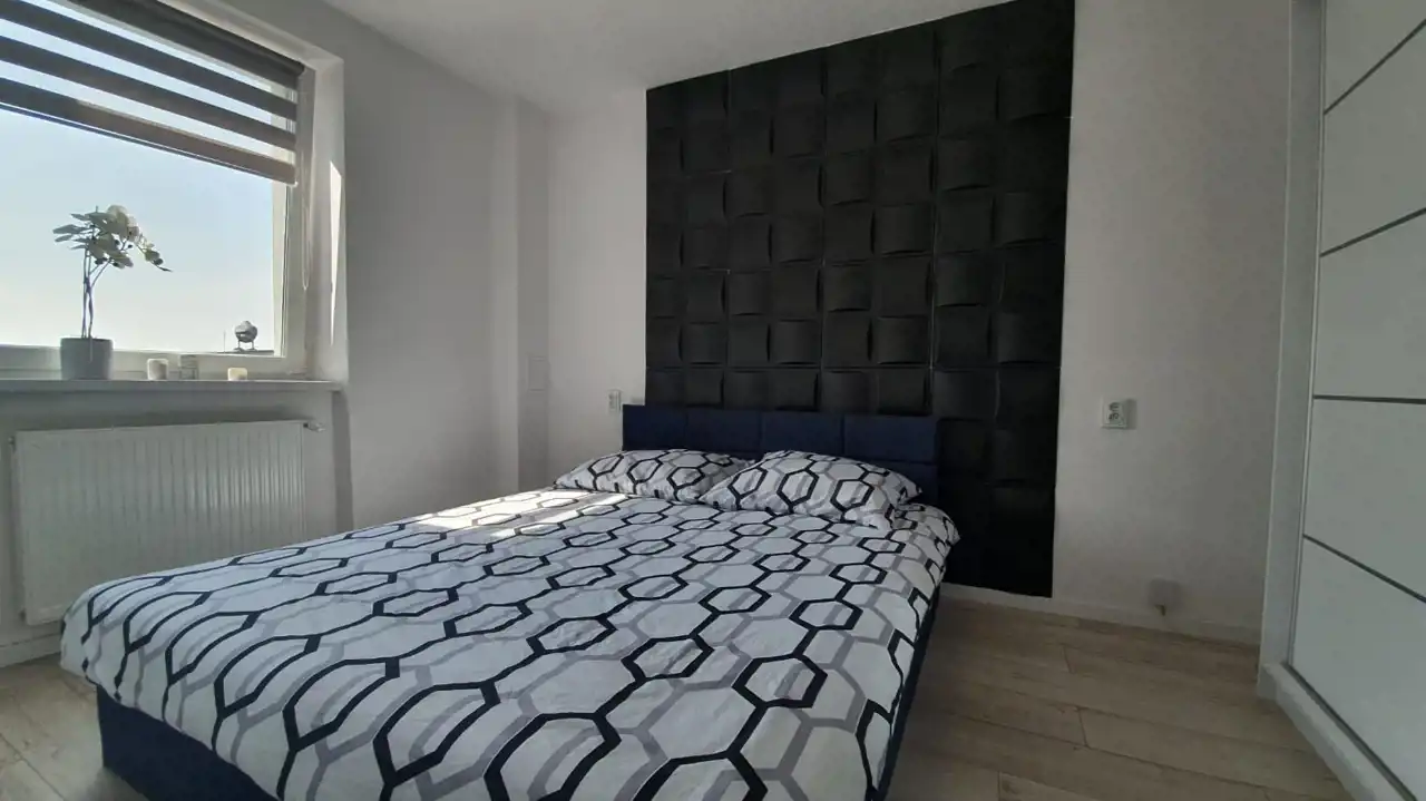 Mieszkanie zostało urządzone w nowoczesnym stylu z dbałością o każdy detal. Zastosowanie modnych barw spełni oczekiwania najbardziej wymagających klientów. Efektowna, biała kuchnia w zabudowie została zaopatrzona w sprzęt taki jak: lodówko-zamrażarka Indesit (czarna na wysoki połysk), piekarnik z płytą gazową Amica, zmywarka Electrolux i nowoczesny pochłaniacz. W przytulnej i bardzo estetycznej łazience, ściany i podłogę pokryto kaflami. Pomieszczenie to wyposażono w nowoczesną kabinę prysznicową wraz z efektownym, podświetlanym zestawem natryskowym. W sypialni zamontowano funkcjonalną szafę, oraz duże łóżko typu king-size, za którym znajduje się imponująca ściana w odcieniu głębokiej czerni. Sercem nieruchomości jest jasny salon, stanowiący strefę relaksu. Dzięki dużej rogowej kanapie, wypoczynek będzie prawdziwą przyjemnością. Wyposażenie tego pokoju obejmuje także komodę, szafkę RTV i stolik kawowy, wykonane na wysoki połysk w kolorze białym.