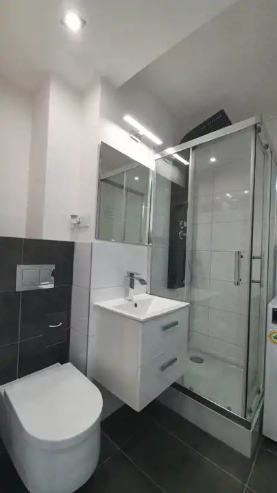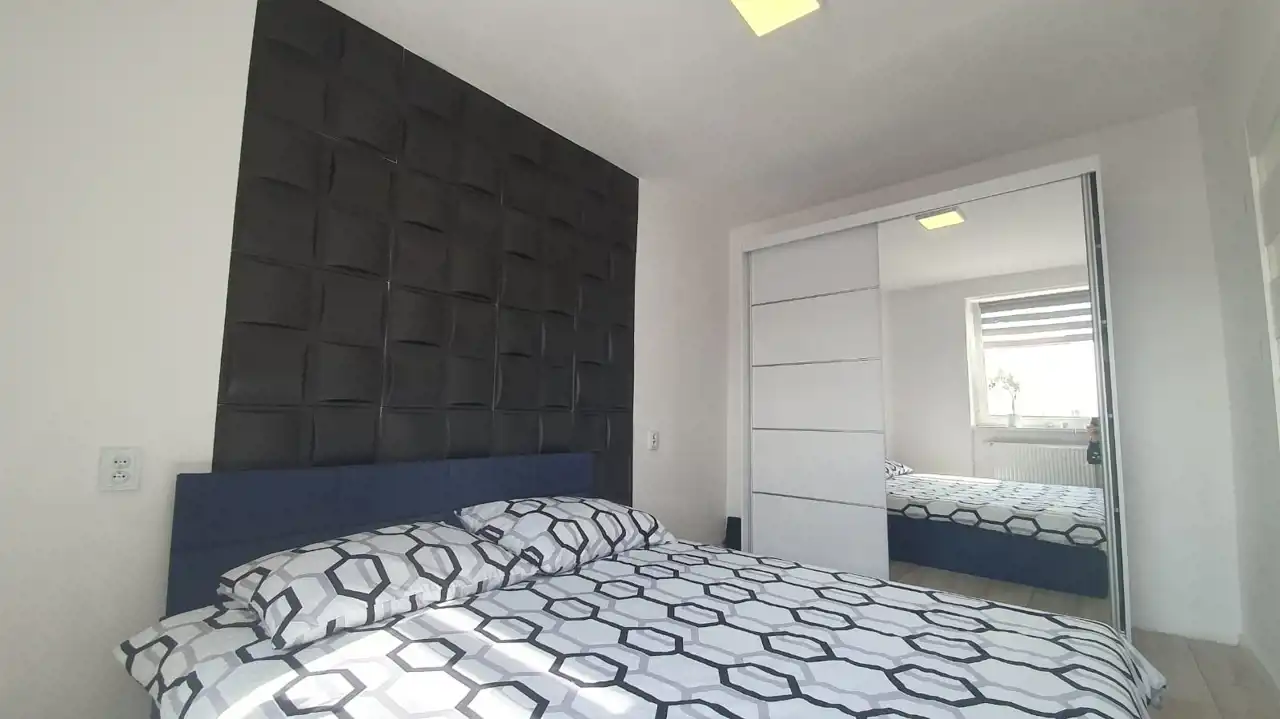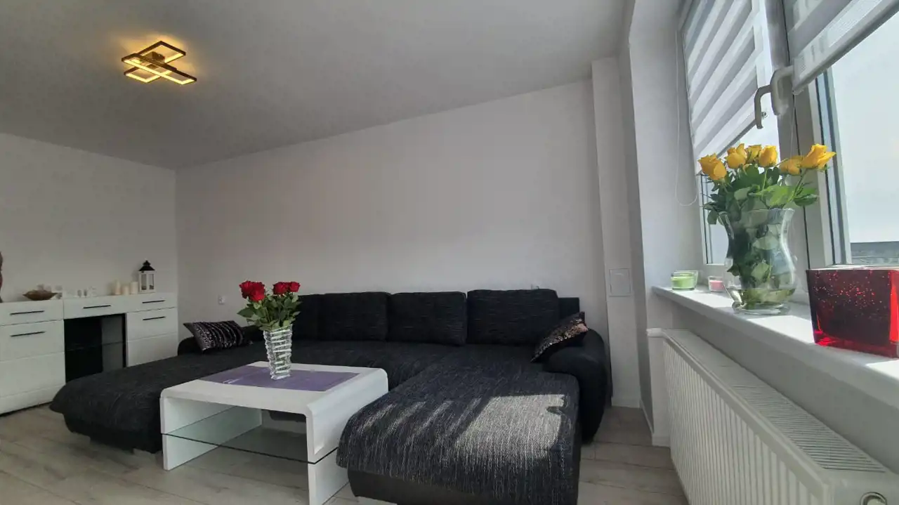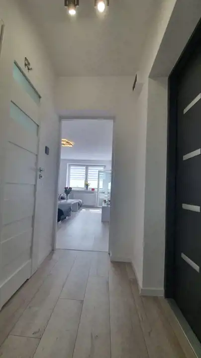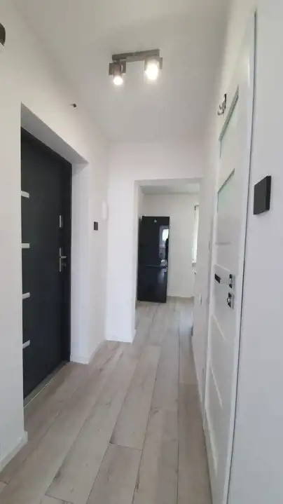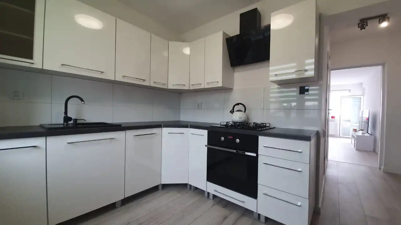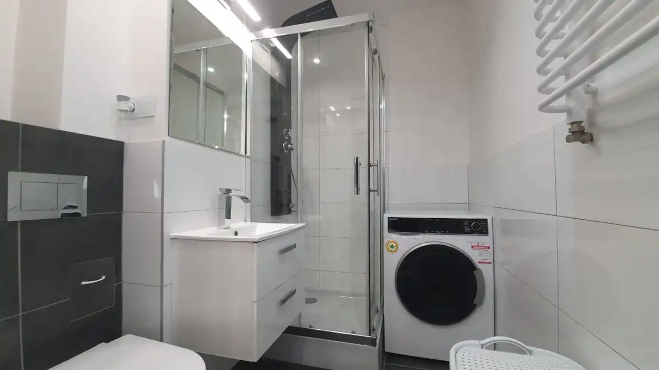 Mieszkanie zostało urządzone w nowoczesnym stylu z dbałością o każdy detal. Zastosowanie modnych barw spełni oczekiwania najbardziej wymagających klientów. Efektowna, biała kuchnia w zabudowie została zaopatrzona w sprzęt taki jak: lodówko-zamrażarka Indesit (czarna na wysoki połysk), piekarnik z płytą gazową Amica, zmywarka Electrolux i nowoczesny pochłaniacz. W przytulnej i bardzo estetycznej łazience, ściany i podłogę pokryto kaflami. Pomieszczenie to wyposażono w nowoczesną kabinę prysznicową wraz z efektownym, podświetlanym zestawem natryskowym. W sypialni zamontowano funkcjonalną szafę, oraz duże łóżko typu king-size, za którym znajduje się imponująca ściana w odcieniu głębokiej czerni. Sercem nieruchomości jest jasny salon, stanowiący strefę relaksu. Dzięki dużej rogowej kanapie, wypoczynek będzie prawdziwą przyjemnością. Wyposażenie tego pokoju obejmuje także komodę, szafkę RTV i stolik kawowy, wykonane na wysoki połysk w kolorze białym.