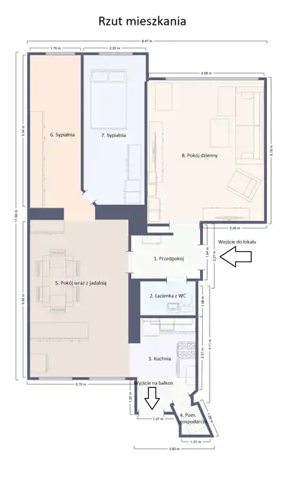 Łączna powierzchnia użytkowa mieszkania - 74,43 m2.