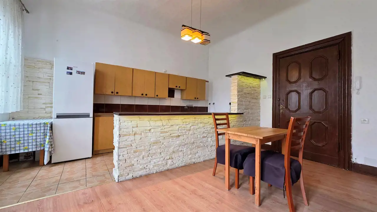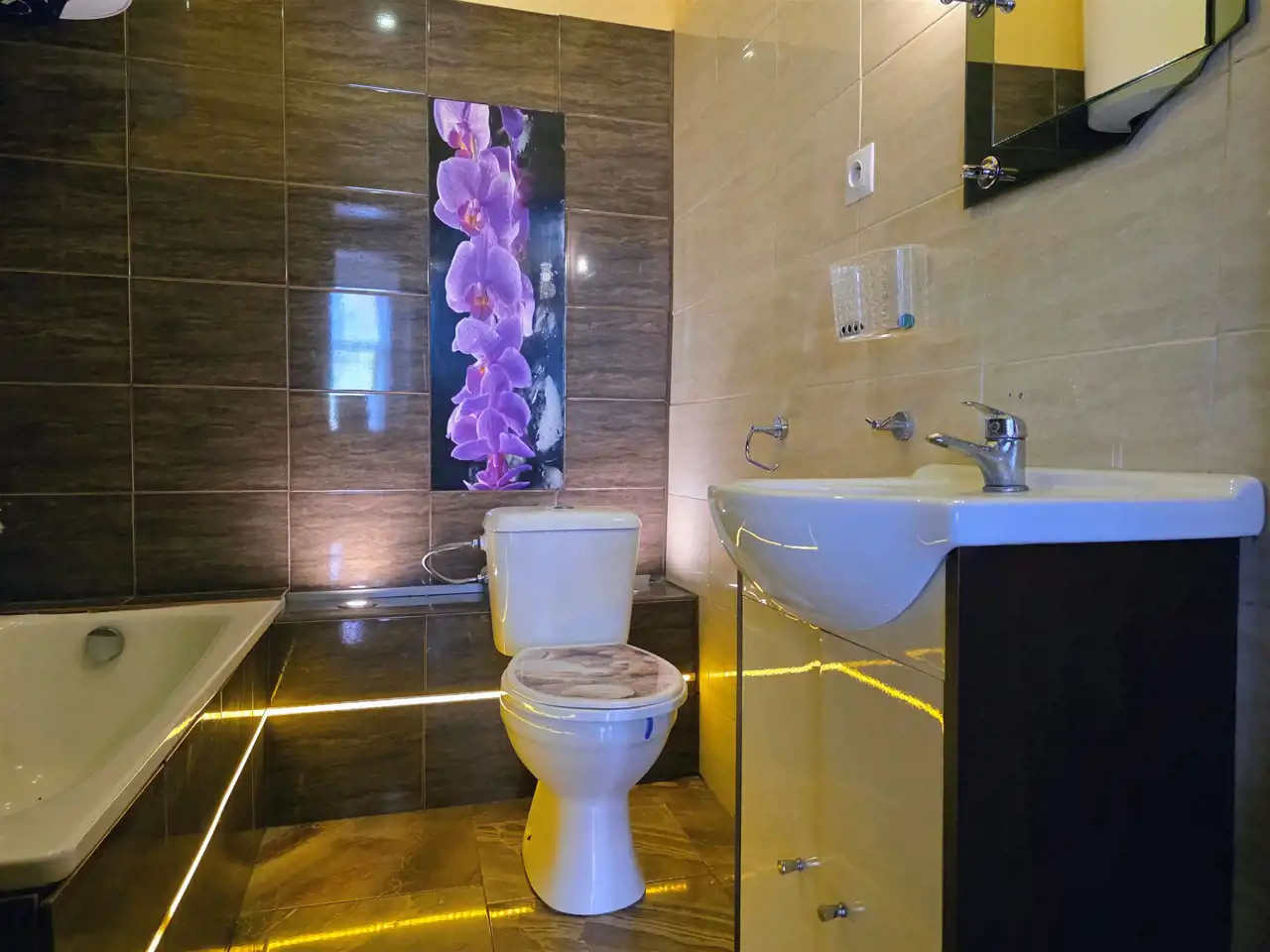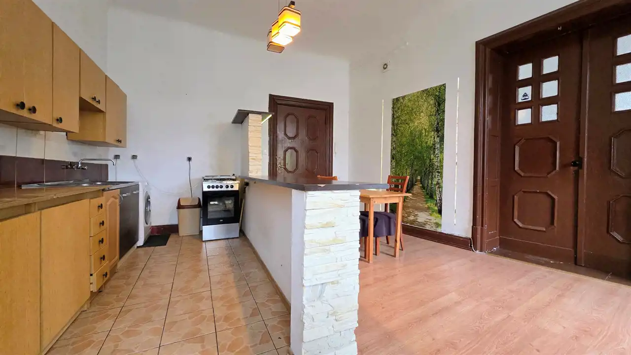 Kuchnia z wyjściem na balkon została urządzona w meble kuchenne oraz sprzęt AGD: lodówko - zamrażarkę Polar, kuchenkę gazową Beko oraz pralkę Indesit. W łazience położony jest gres na podłodze oraz płytki na ścianach. Dodatkowo łazienka wyposażona jest w wannę, umywalkę nablatową z szafką, lustro oraz WC. W pokojach ułożono panele podłogowe w kolorze jasnego dębu, a na ścianach położono gładzie oraz tapety. Dodatkowo jedna sypialnia jest z balkonem.