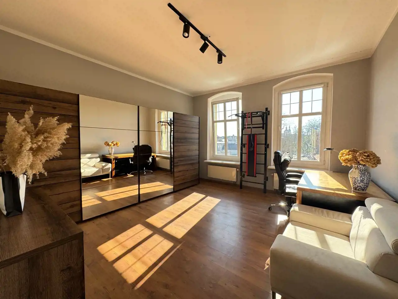 - Funkcjonalny dodatkowy pokój – doskonałe miejsce na gabinet, pokój dziecięcy lub pokój gościnny, wyposażony w pojemną szafę z lustrami, komodę oraz fotel.