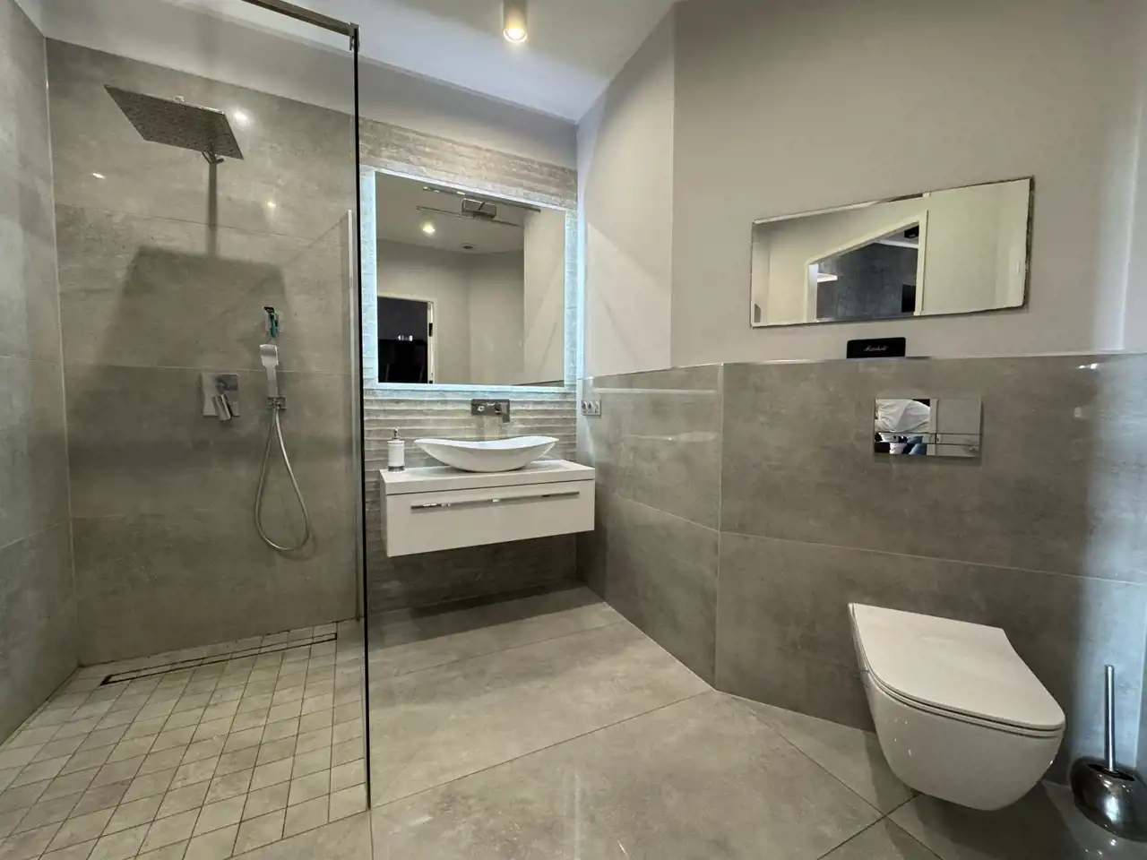 - Elegancka łazienka – duże nowoczesne kafle, bezbrodzikowy prysznic oraz wysokiej jakości armatura to gwarancja komfortu i stylu.
