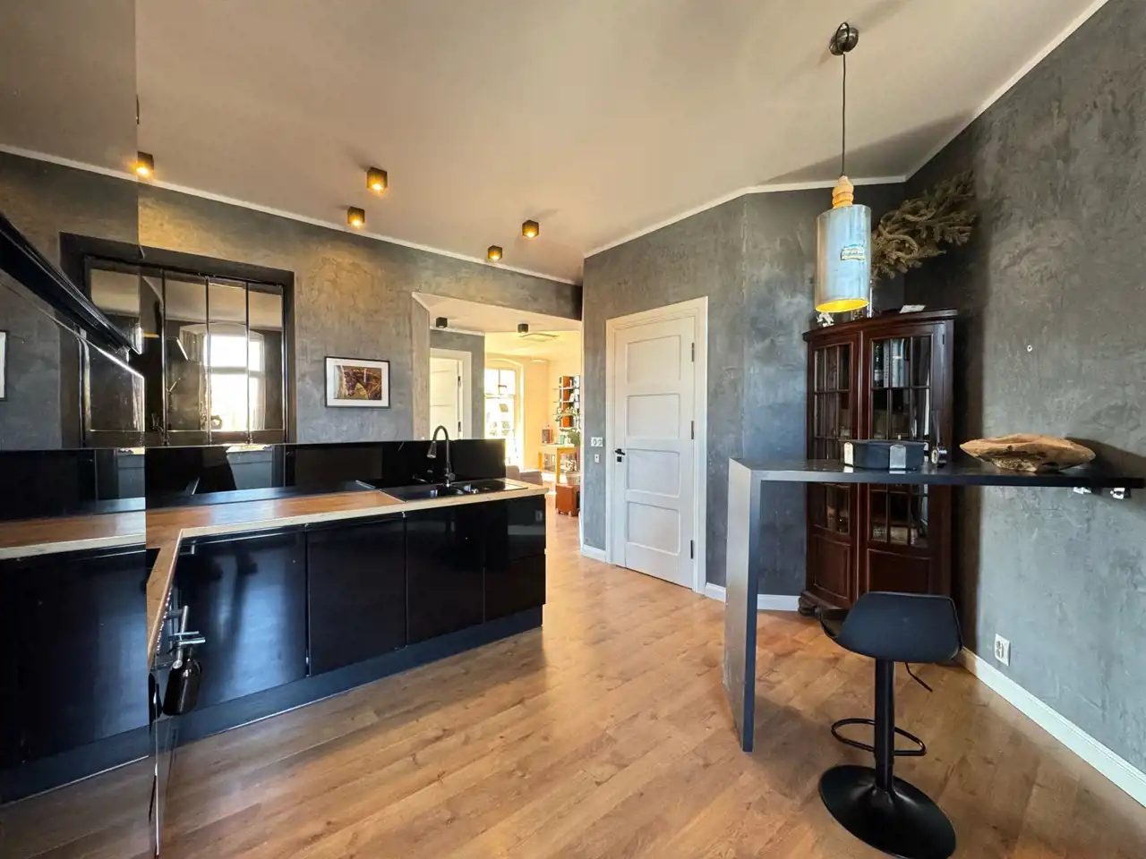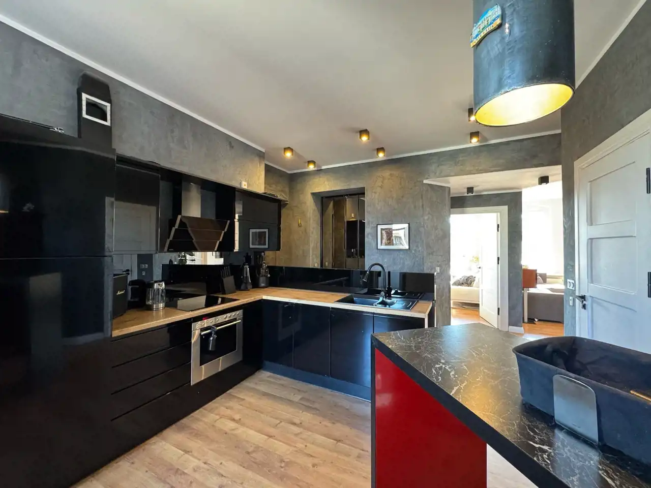 - Stylowa kuchnia – czarna, elegancka zabudowa na wymiar nadaje wnętrzu nowoczesnego charakteru, a sprzęty AGD najwyższej klasy (piekarnik, płyta indukcyjna, lodówka, zmywarka, pralka) sprawiają, że gotowanie staje się prawdziwą przyjemnością.
