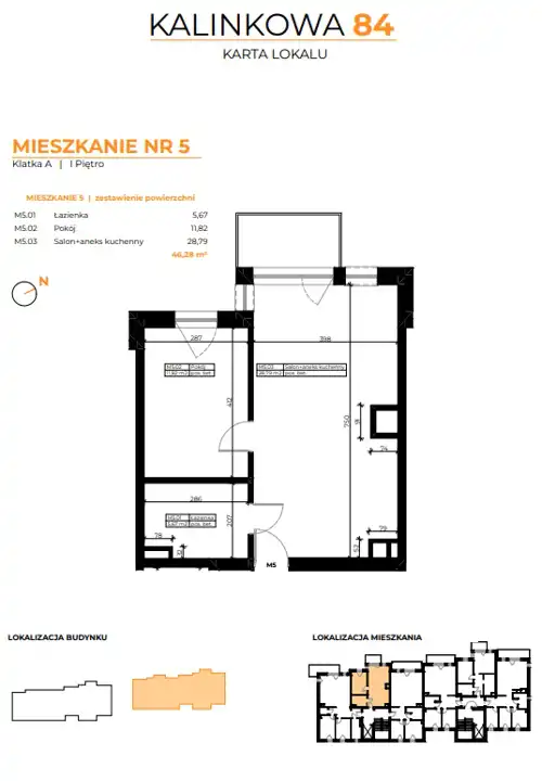 - Charakterystyka mieszkania 46.28 m2, 2 pokoje