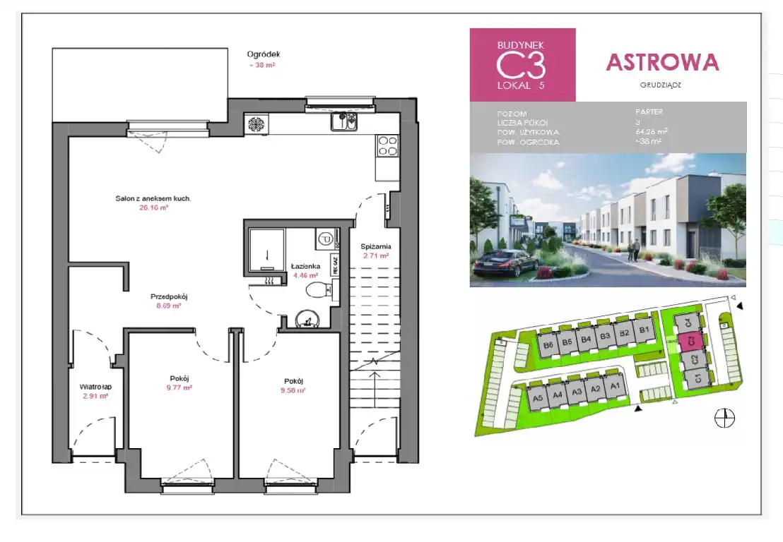 3-POKOJOWY APARTAMENT O POWIERZCHNI 64,26 m2 Z POMIESZCZENIEM GOSPODARCZYM, OGRÓDKIEM I MIEJSCEM PARKINGOWYM.
