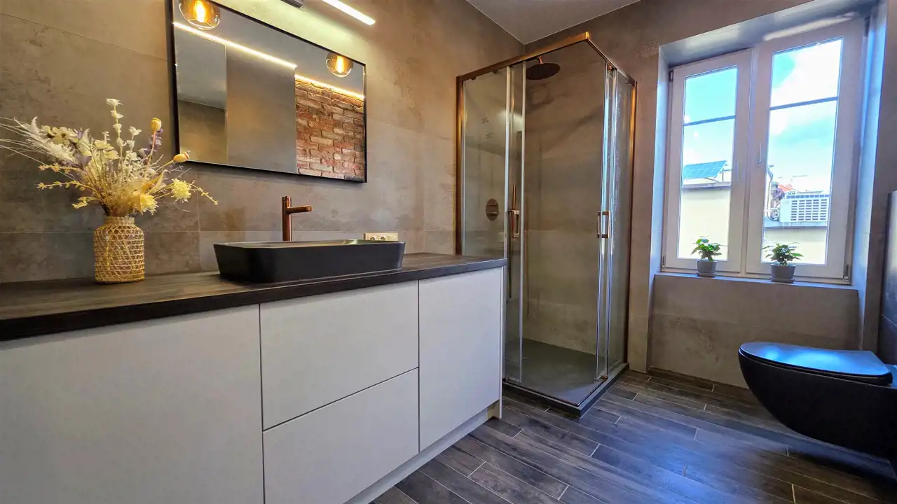Mieszkanie zaprojektowane zostało z dużą starannością i daje poczucie świeżości i estetyki. Efektowna kuchnia w kolorze cappuccino została wyposażona w niezbędny sprzęt AGD: piekarnik elektryczny, pochłaniacz, płytę indukcyjną, zmywarkę, lodówko - zamrażarkę firmy Whirlpool. Nowoczesna łazienka została zaprojektowana i wyposażono w efektowną kabinę prysznicową z odpływem liniowym, wiszącą misę sedesową, pralkę Whirlpool, umywalkę na blacie oraz otwieraną dwuskrzydłową szafę z szufladami pod zlewem. Charakter temu pomieszczeniu nadają też świetnie dobrany, gustowny gres w kolorze kamienia, naturalna cegła na ścianie i nowoczesne lustro, które optycznie powiększa łazienkę. Na podłogach nieruchomości położone zostały panele podłogowe w kolorze drewna, a w łazience gres w kolorze kamienia naturalnego. Ściany w pokojach zostały pokryte gładzią i pomalowane białą farbą firmy Tikkurila. Na sufitach zastosowano emulsje antyrefleksyjną, która optycznie wyrównuje powierzchnię oraz odbija promienie świetlne pod niskim kątem. W przedpokoju została zamontowano praktyczna szafa dwudrzwiowa typu Komandor. Bezpieczeństwo zapewniają domofon i drzwi antywłamaniowe. Mieszkanie jest jasne dzięki wyposażeniu je w wiele gustownych lamp oraz praktycznych punków świetlnych, jest również rozkładowe, a do tego słoneczne, ciepłe i bardzo ekonomiczne.