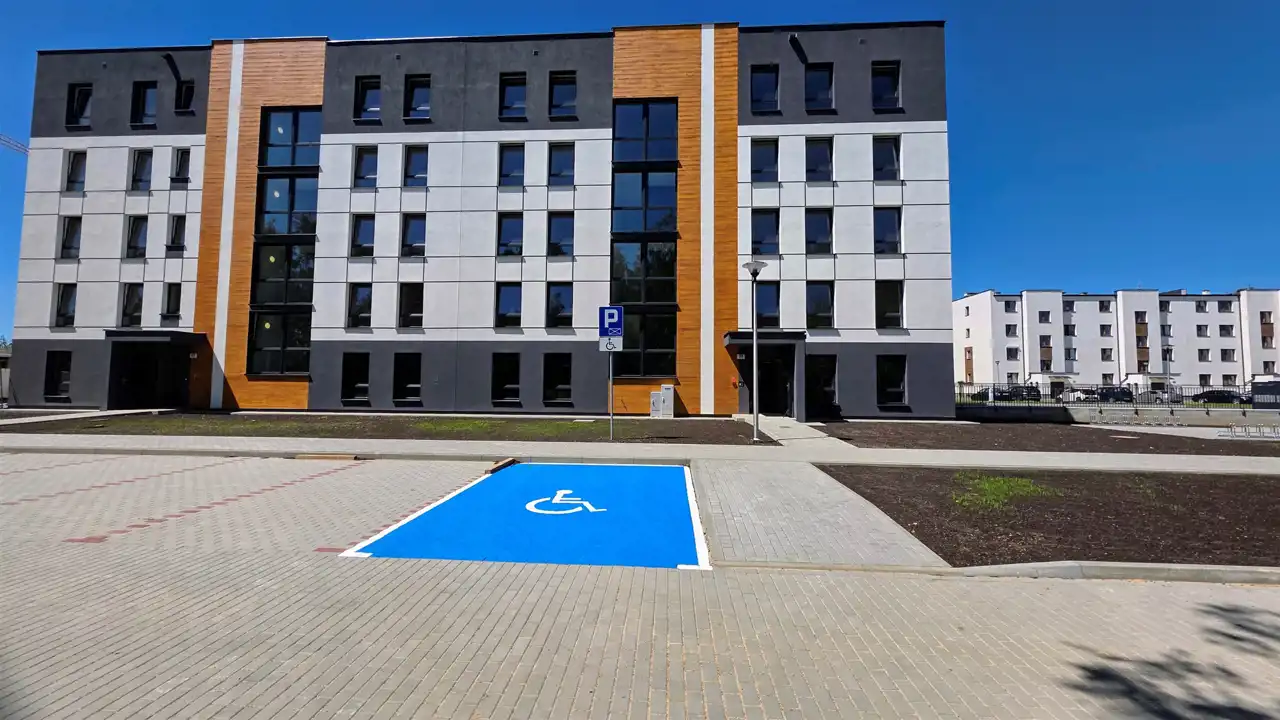- dużą ilością miejsc parkingowych dla aut na zewnątrz budynku oraz miejscami parkingowymi dla rowerów;