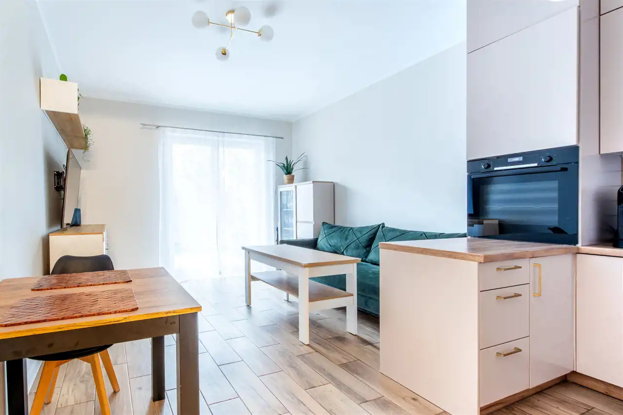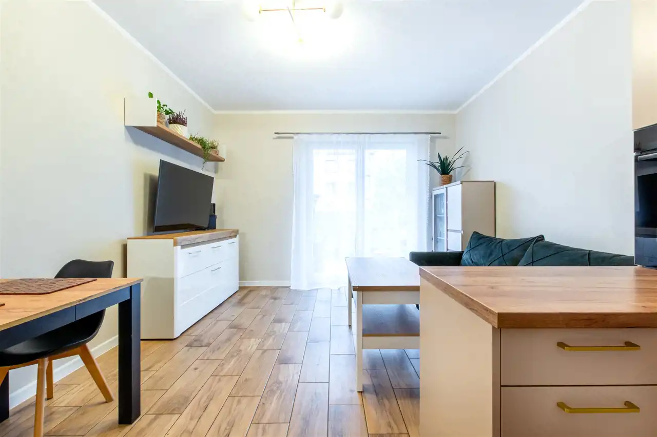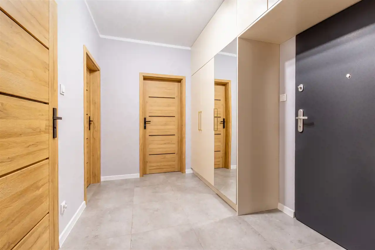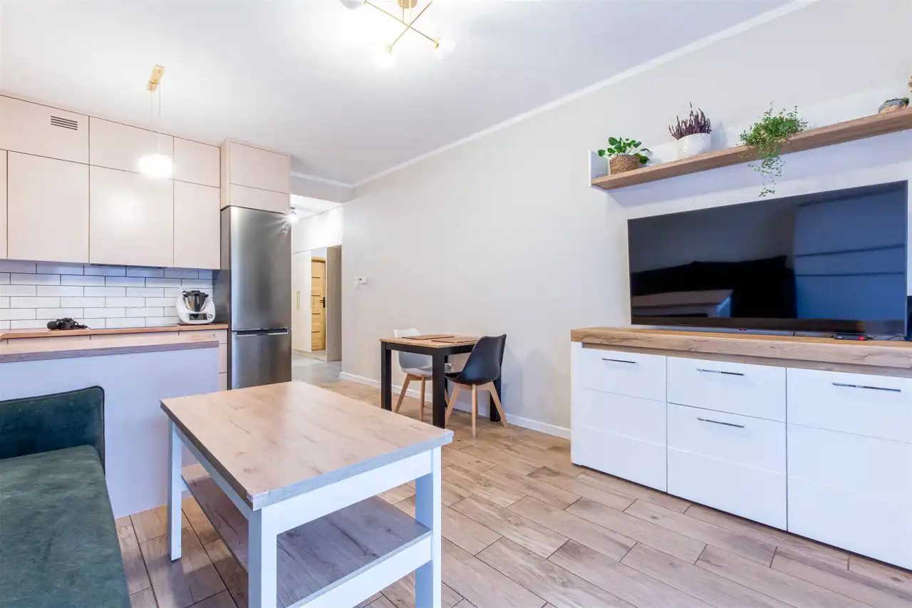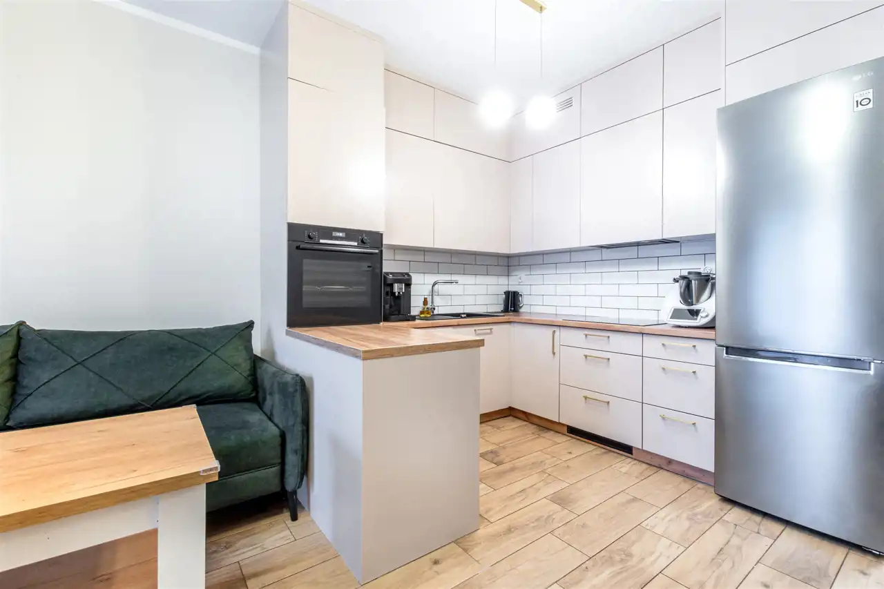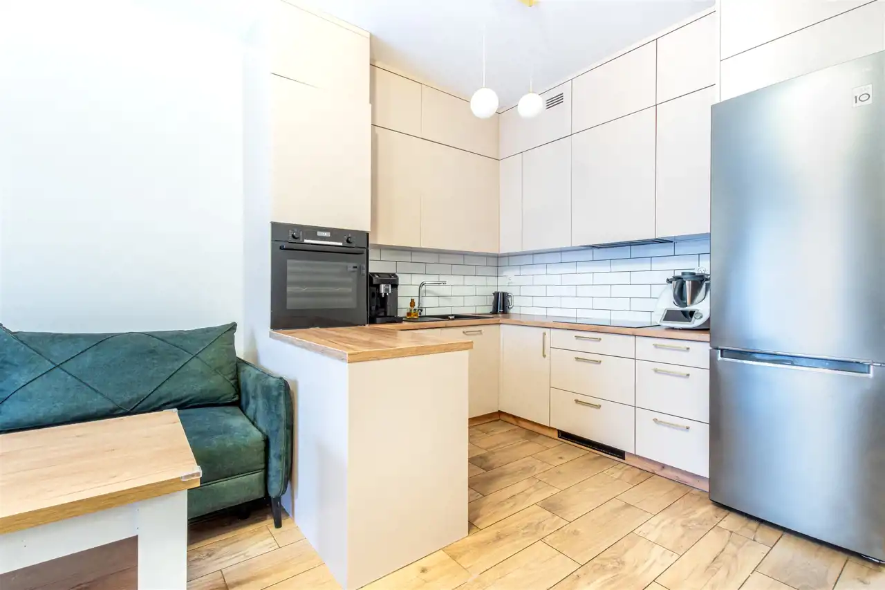 Mieszkanie wyposażone zostało w kuchnię wraz z sprzętem AGD (lodówko-zamrażarka, zmywarka, kuchenka elektryczna, płyta indukcyjna, pochłaniacz), wykonaną na wymiar dzięki czemu idealnie wpasowuje się w przestrzeń i w pełni spełnia swoją funkcjonalność. Łazienka została urządzona w nowoczesnym stylu, zaopatrzona w wannę, miejsce na pralkę oraz suszarkę. W przedpokoju zamontowano pojemną szafę w zabudowie.