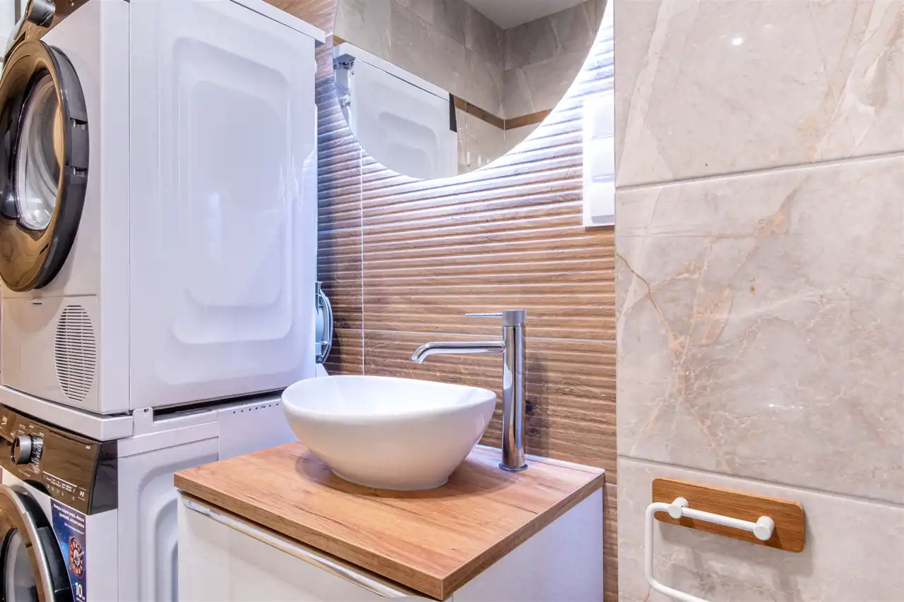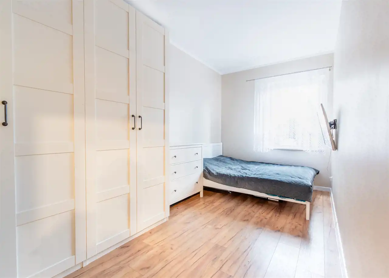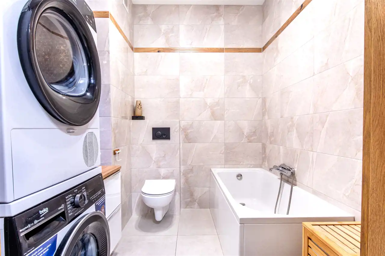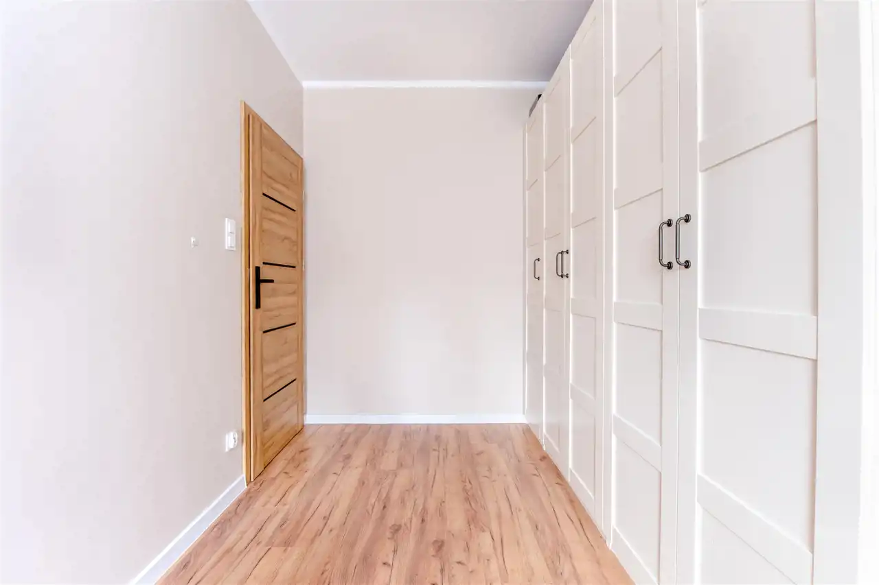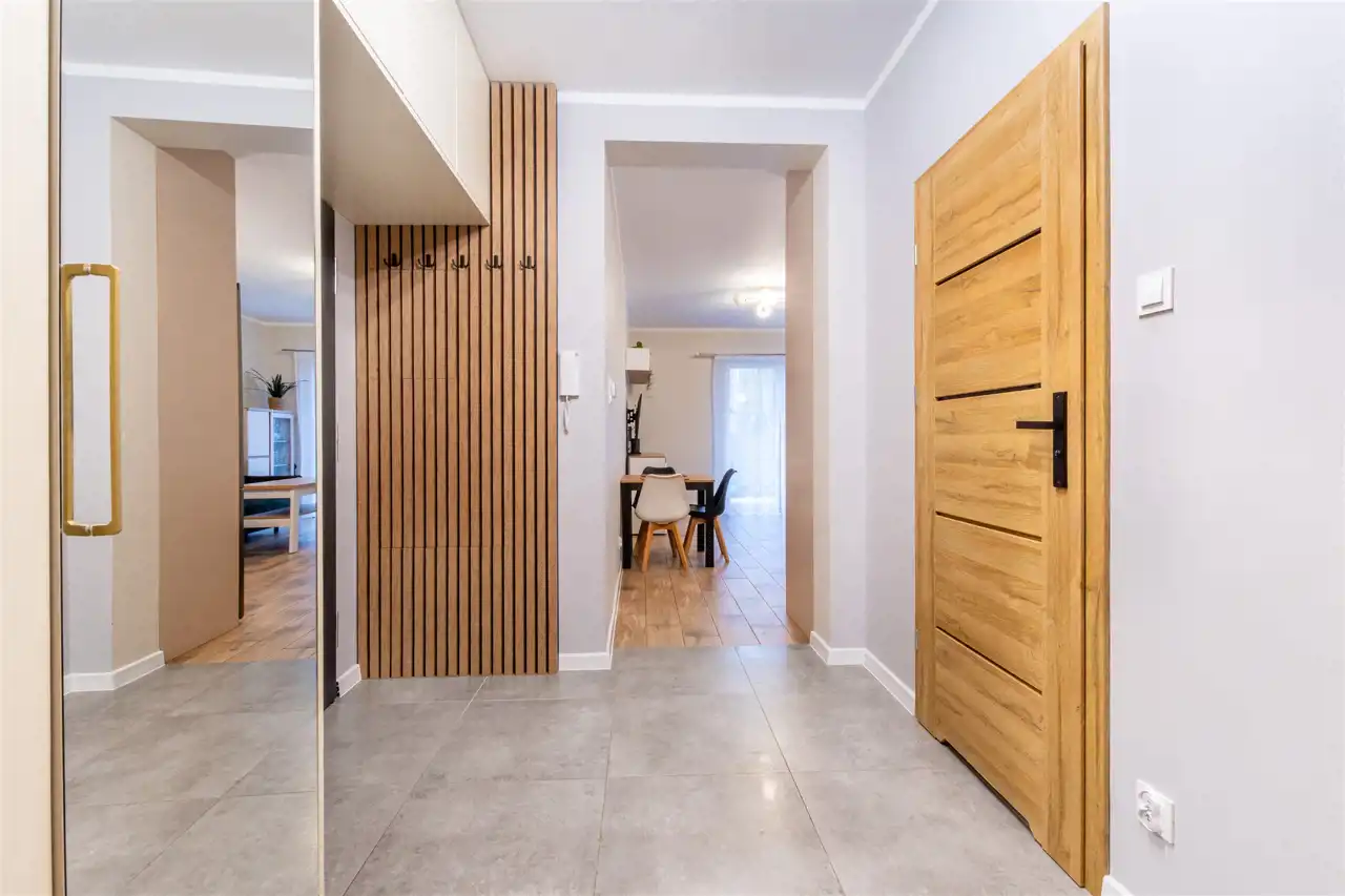 Mieszkanie wyposażone zostało w kuchnię wraz z sprzętem AGD (lodówko-zamrażarka, zmywarka, kuchenka elektryczna, płyta indukcyjna, pochłaniacz), wykonaną na wymiar dzięki czemu idealnie wpasowuje się w przestrzeń i w pełni spełnia swoją funkcjonalność. Łazienka została urządzona w nowoczesnym stylu, zaopatrzona w wannę, miejsce na pralkę oraz suszarkę. W przedpokoju zamontowano pojemną szafę w zabudowie.