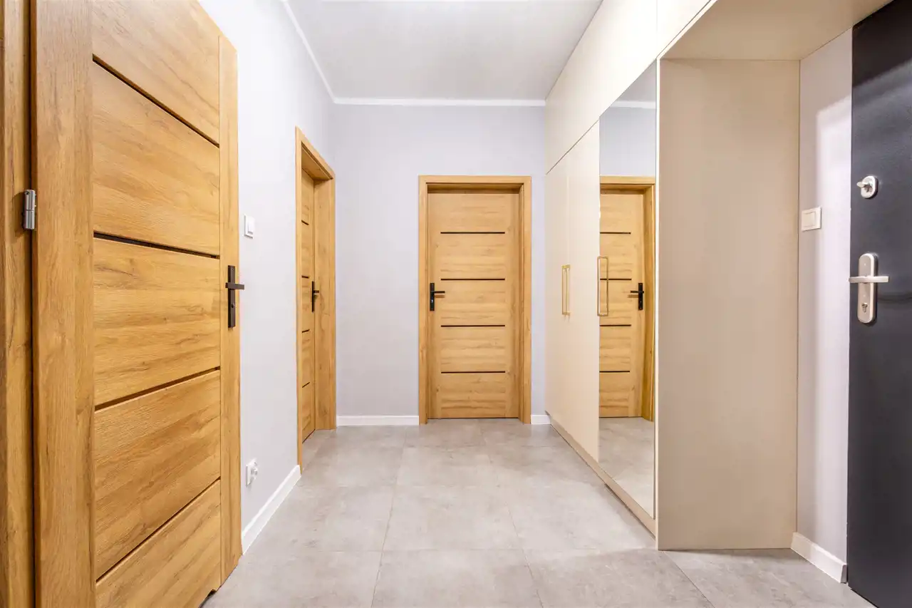 Mieszkanie wyposażone zostało w kuchnię wraz z sprzętem AGD (lodówko-zamrażarka, zmywarka, kuchenka elektryczna, płyta indukcyjna, pochłaniacz), wykonaną na wymiar dzięki czemu idealnie wpasowuje się w przestrzeń i w pełni spełnia swoją funkcjonalność. Łazienka została urządzona w nowoczesnym stylu, zaopatrzona w wannę, miejsce na pralkę oraz suszarkę. W przedpokoju zamontowano pojemną szafę w zabudowie.