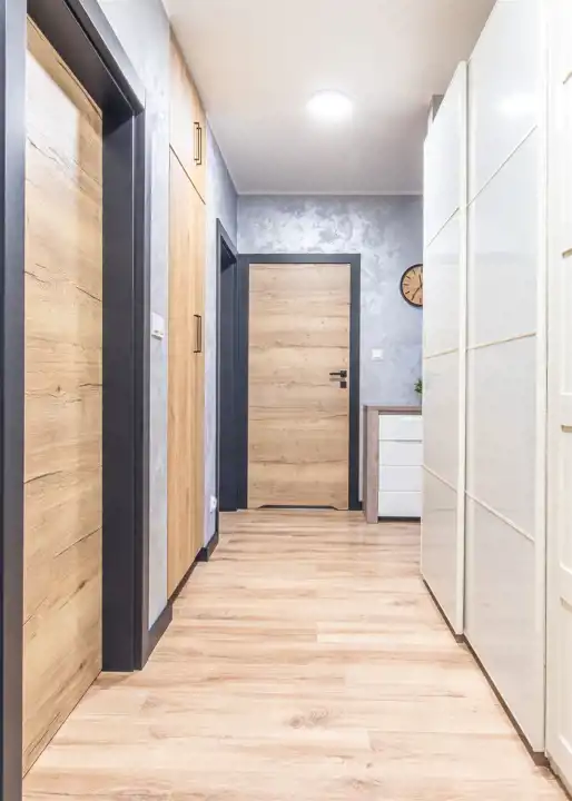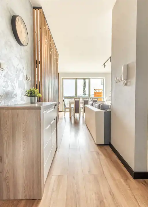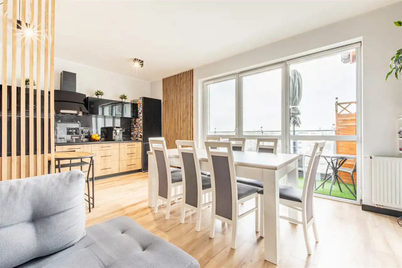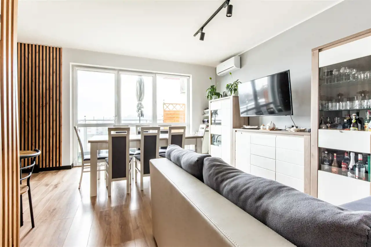 - Wnętrze z charakterem- jasna, nowoczesna przestrzeń z dużą ilością naturalnego światła. Stylowe połączenie szarości i bieli tworzy elegancki, ale przytulny charakter.