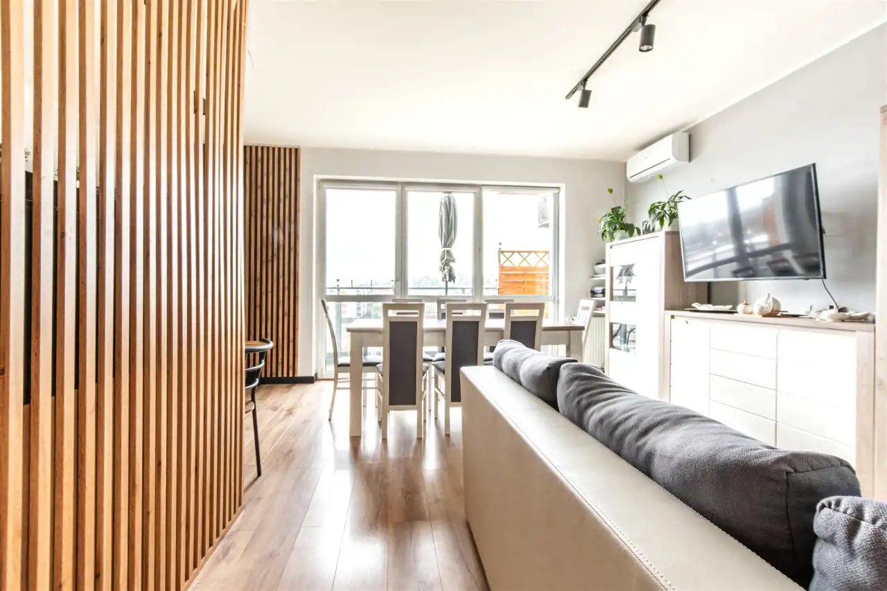 - Strefa dzienna- przestronny salon z dużym oknem i wyjściem na balkon. Wygodna sofa narożna, nowoczesne oświetlenie sufitowe, lamele.