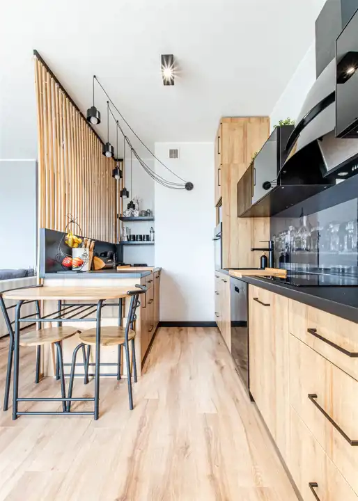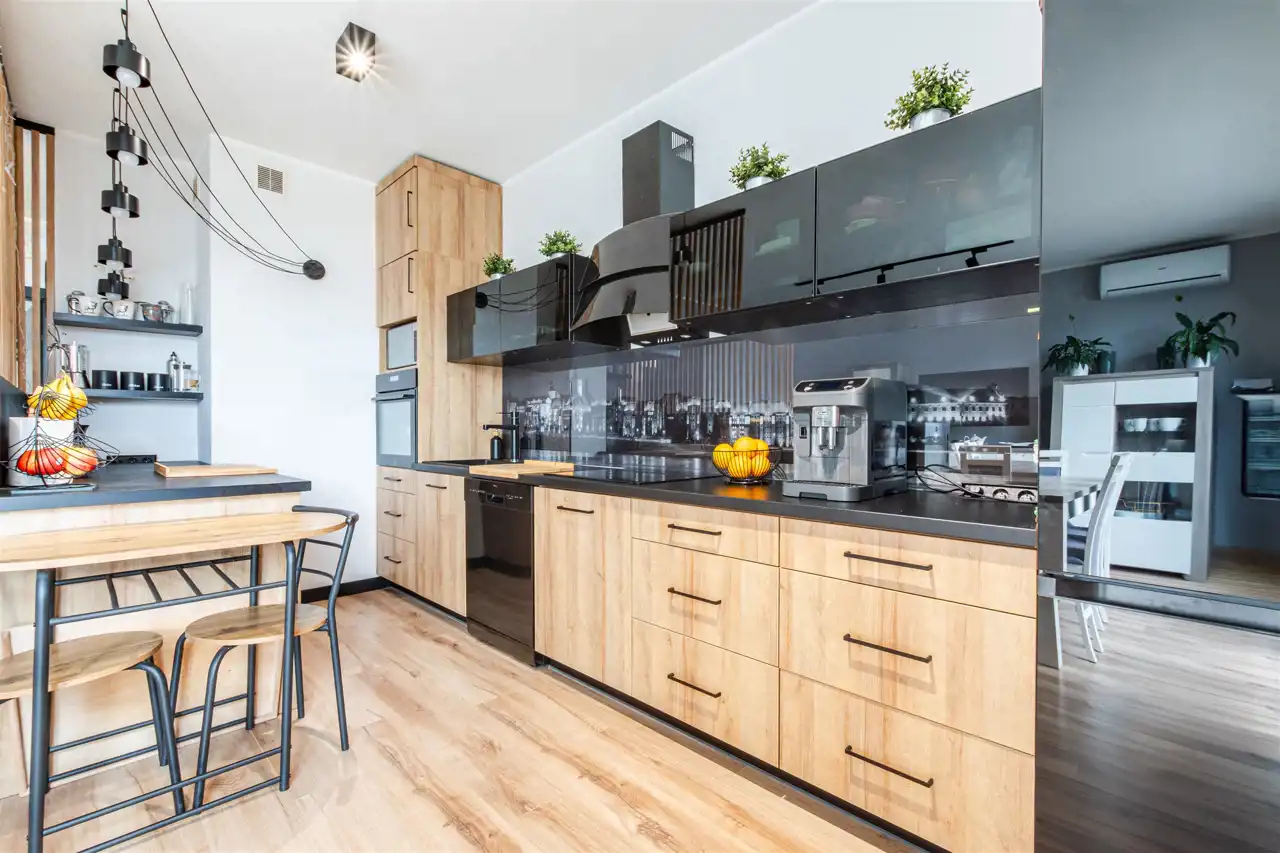 - Kuchnia z wyspą- zabudowa wykonana przez stolarza według indywidualnego projektu. Fronty w kolorze czarnym oraz odcieniu drewna, akcenty podkreślają loftowy styl.