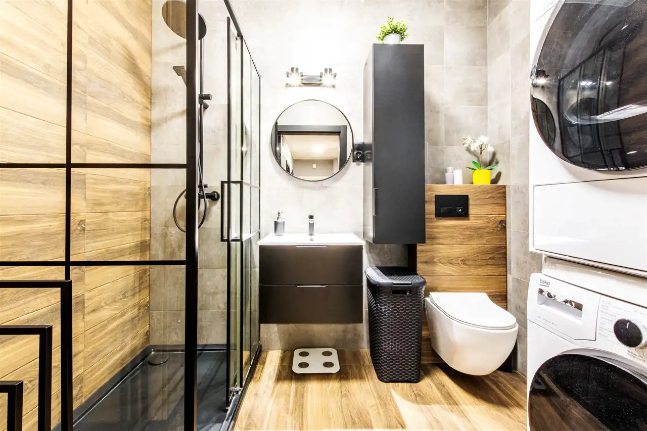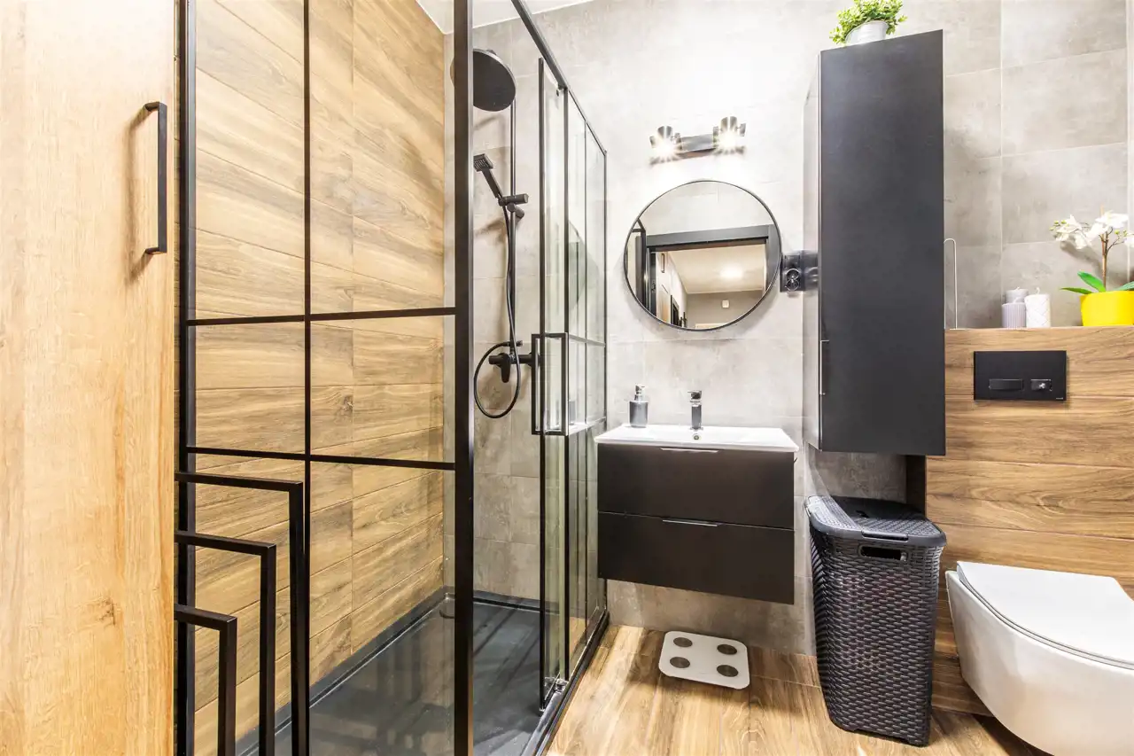 - Łazienka konsekwentne dopełnienie projektu w kolorach czerni i szarości z elementami drewna