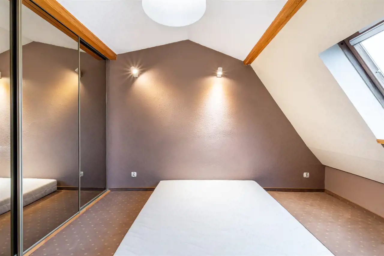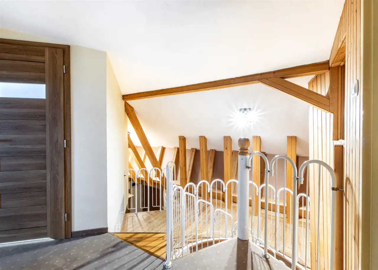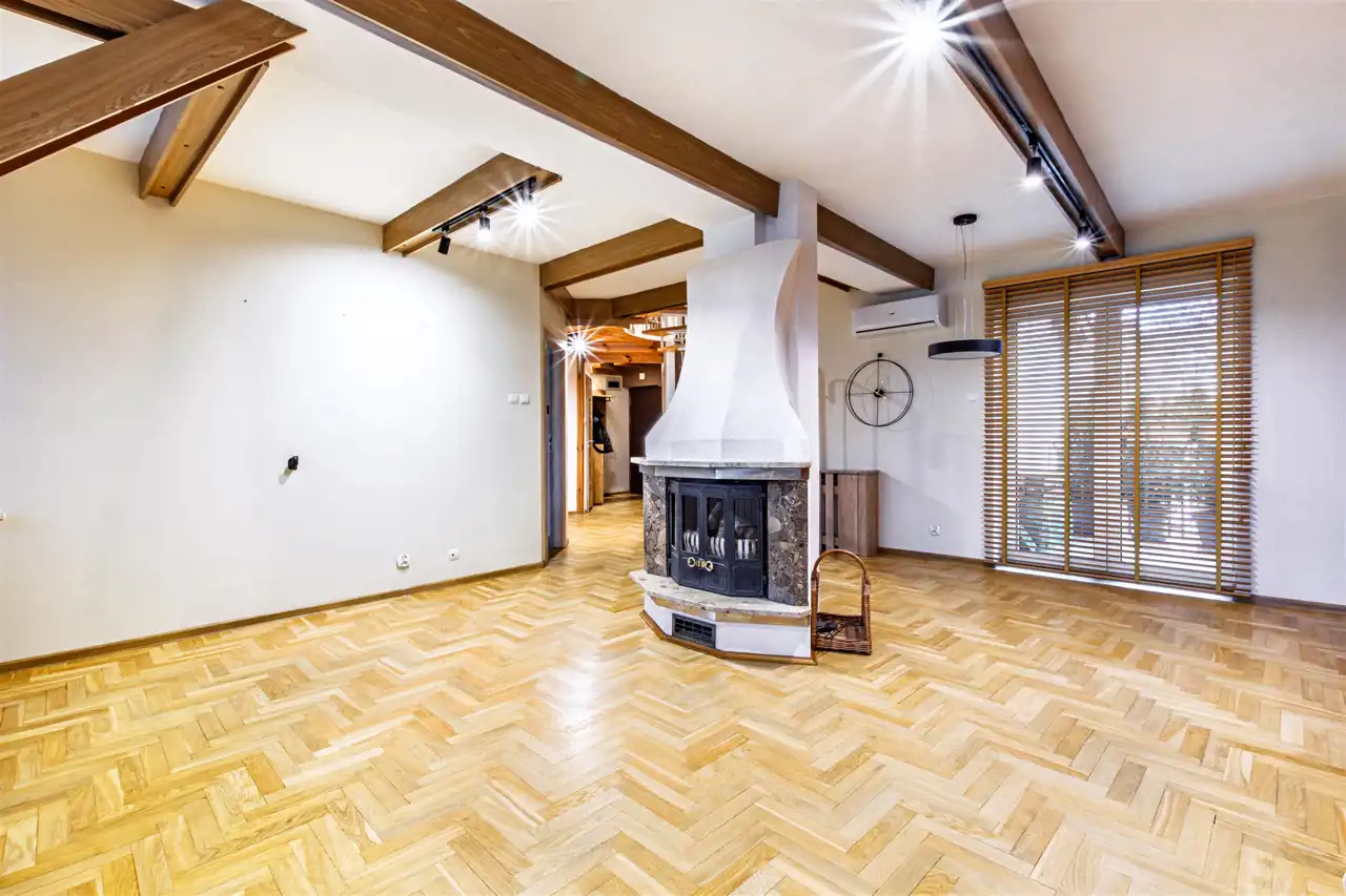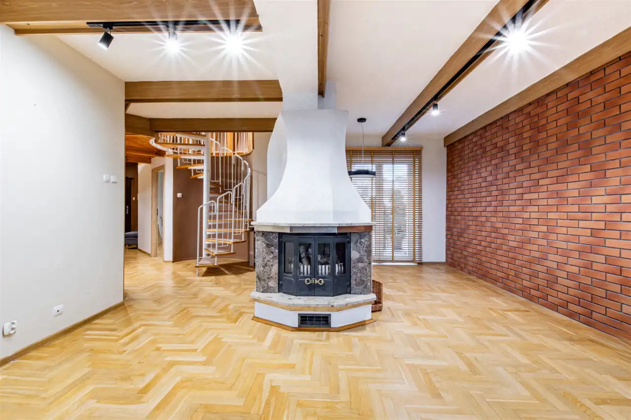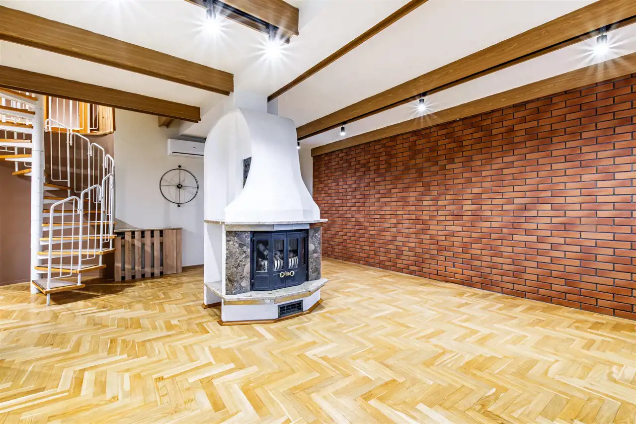 Nieruchomość zaprojektowano z myślą o zapewnieniu komfortu jego mieszkańcom, urządzono z dbałością o każdy detal. Zastosowanie delikatnych barw sprawia, że wnętrze jest ciepłe i przytulne. Wyjątkowy klimat tworzy salon z centralnie usytuowanym kominkiem, a efektowna ściana z czerwonej cegły nadaje wnętrzu charakteru.