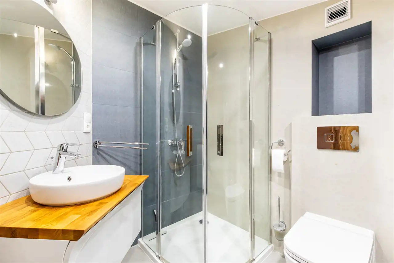 W mieszkaniu znajdują się 2 nowoczesne i w pełni wyposażone, funkcjonalne łazienki oraz dodatkowe wc. Niewątpliwym atutem jest taras, obsadzony tujami stanowiący idealne miejsce do relaksu.