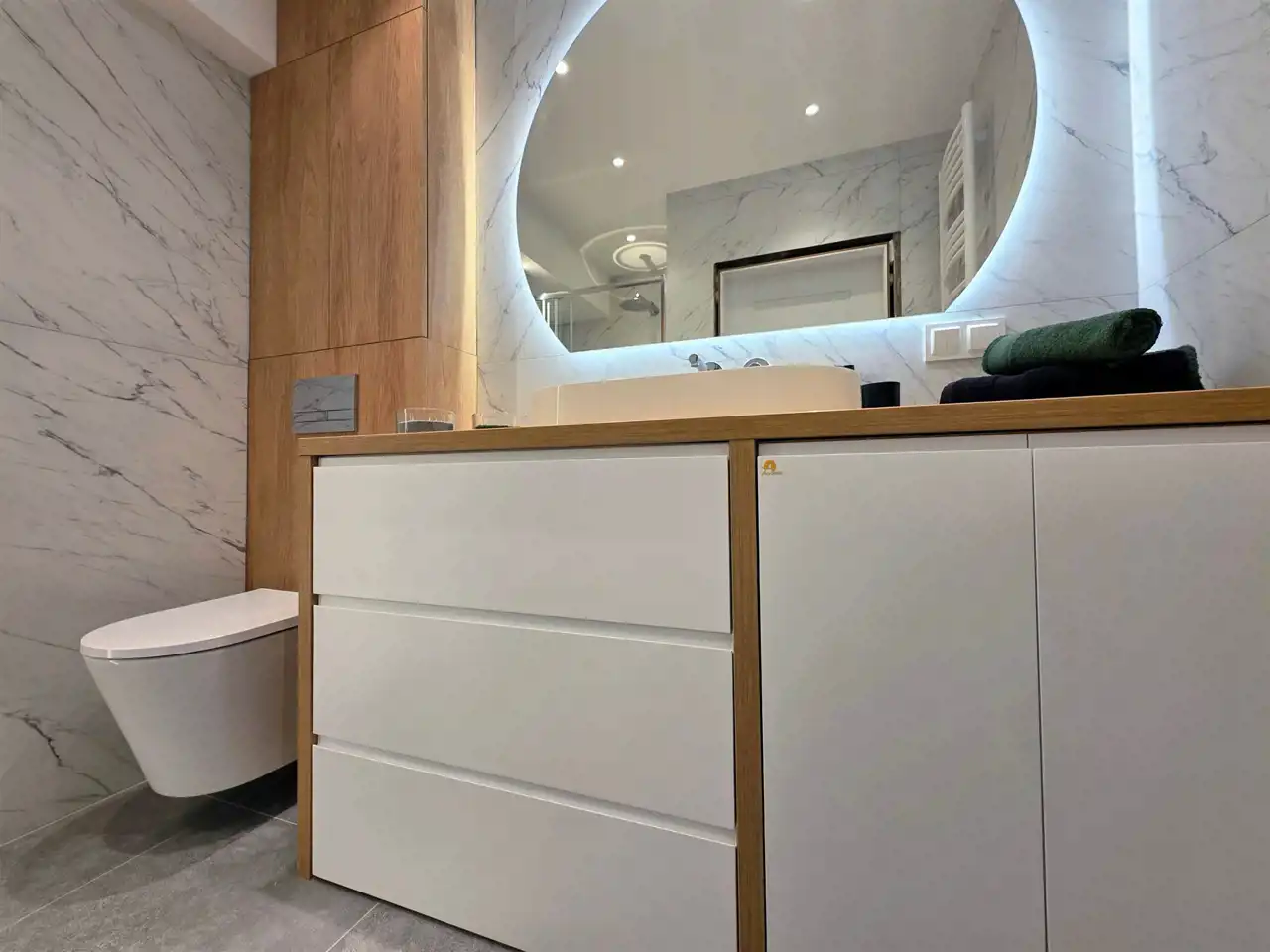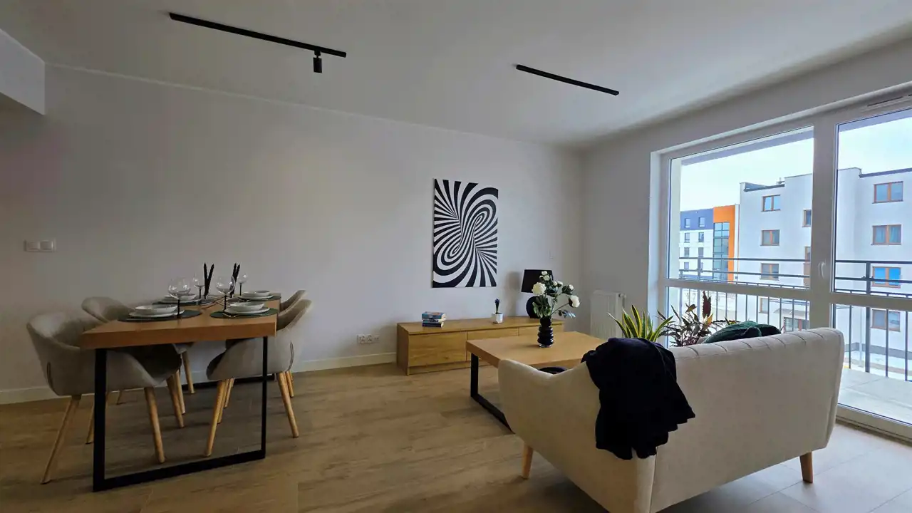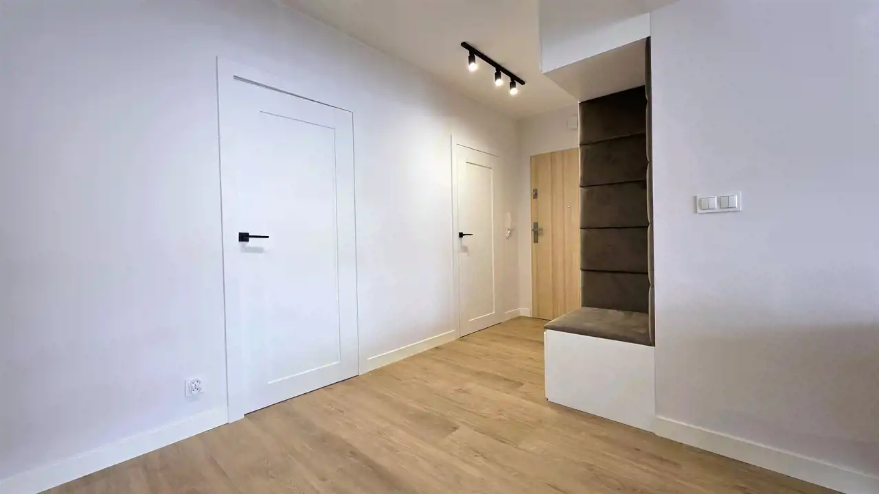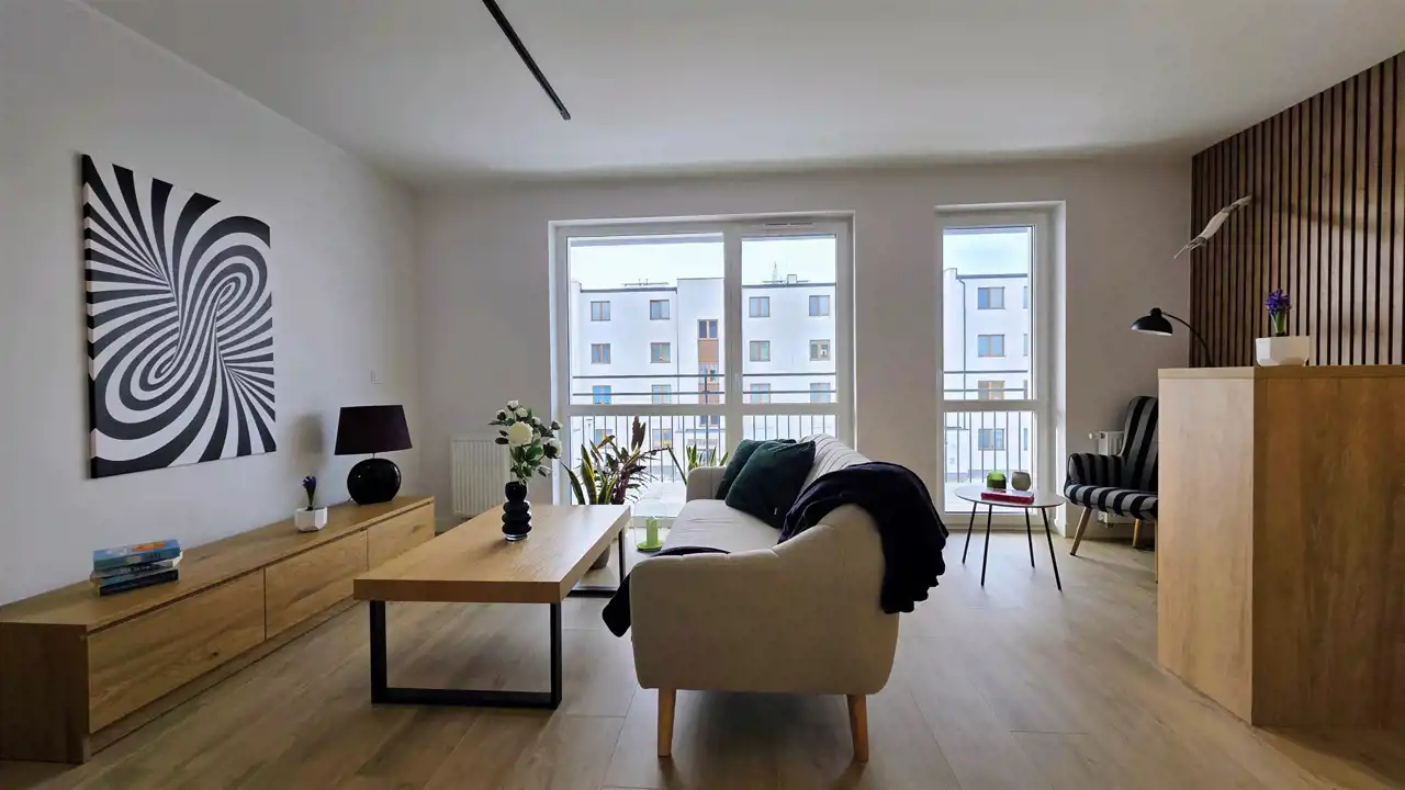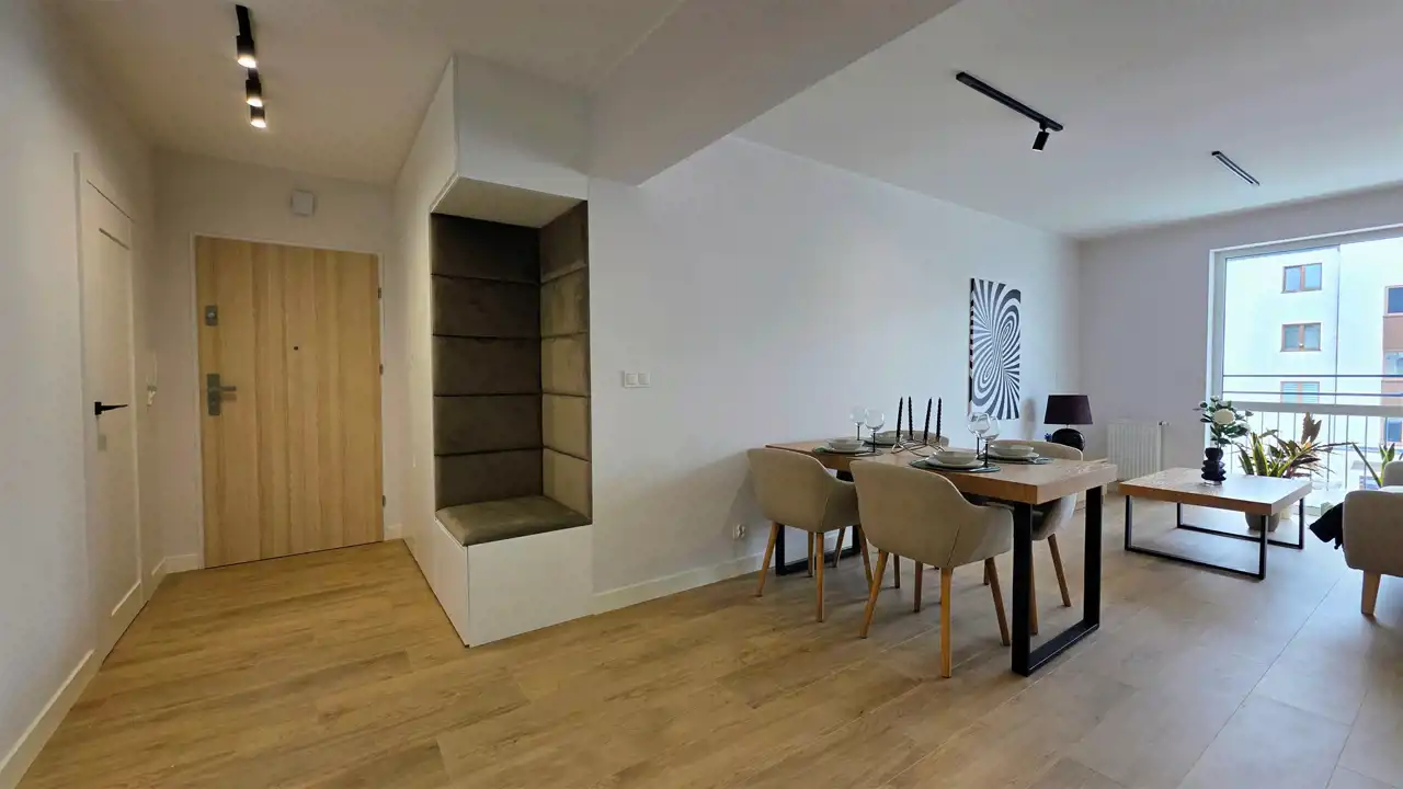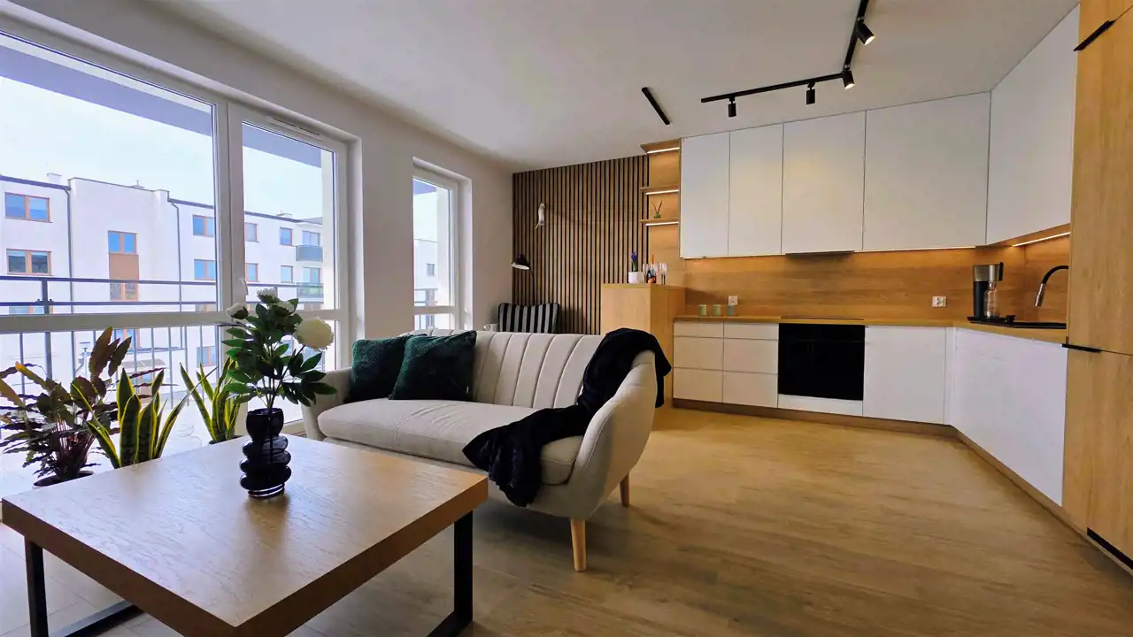 Mieszkanie zaprojektowane zostało z dużą starannością i daje poczucie świeżości i estetyki. Efektowna biała, lakierowana kuchnia z elementami drewna w zabudowie, które to nadaje ciepła wnętrzu. Została wyposażona w niezbędny sprzęt AGD: piekarnik elektryczny, pochłaniacz, płytę indukcyjną, zmywarkę (60cm) oraz lodówko zamrażarkę Ozdobą salonu na jednej ze ścian są zamontowane dekoracyjne lamele w kolorze dąb wotan, które posiadają dodatkowo właściwości akustyczne. Łazienkę wyposażono w efektowną, dużą kabinę prysznicową, wiszącą misę sedesową, pralkę Candy i szafki w zabudowie Charakter temu pomieszczeniu nadają też nowoczesne o dużym formacie jasne płytki i podświetlane lustro, które optycznie powiększa łazienkę. Dodatkowym atutem jest komfortowa, podgrzewana elektrycznie podłoga. Podłogi mieszkania zostały wyłożone jasnymi, wysokiej jakości panelami. Ściany w pokojach zostały pokryte gładzią i pomalowane jasnymi farbami. Na sufitach zastosowano emulsję antyrefleksyjną. Godnym uwagi jest sposób oświetlenia wnętrz, z wykorzystaniem list halogenowych, które pozwoliły na uzyskanie efektu przyjemnej i klimatycznej przestrzeni. W przedpokoju została zamontowano lakierowana dwudrzwiowa szafa w kolorze białym z siedziskiem. Pomieszczenia ogrzewane są kaloryferami wyposażonymi w termostaty. Na przestronnym balkonie został położony na dystansach, bezfugowo gres mrozoodporny na wpływ zróżnicowanych temperatur, wilgoć oraz oddziaływanie promieni UV.
