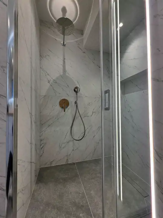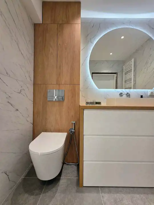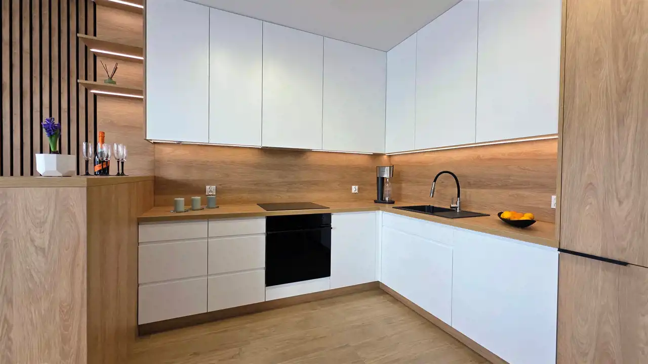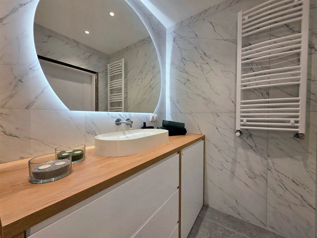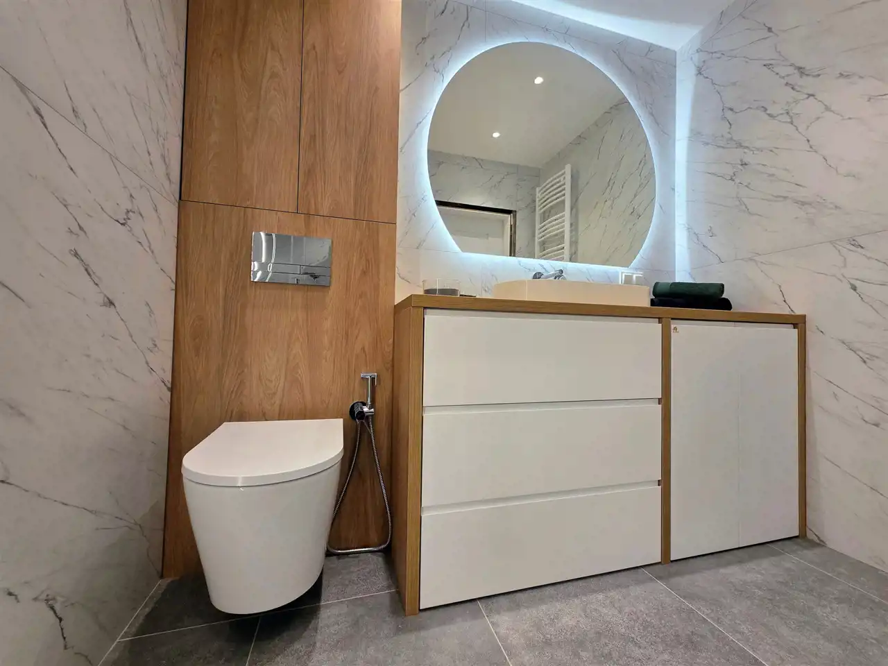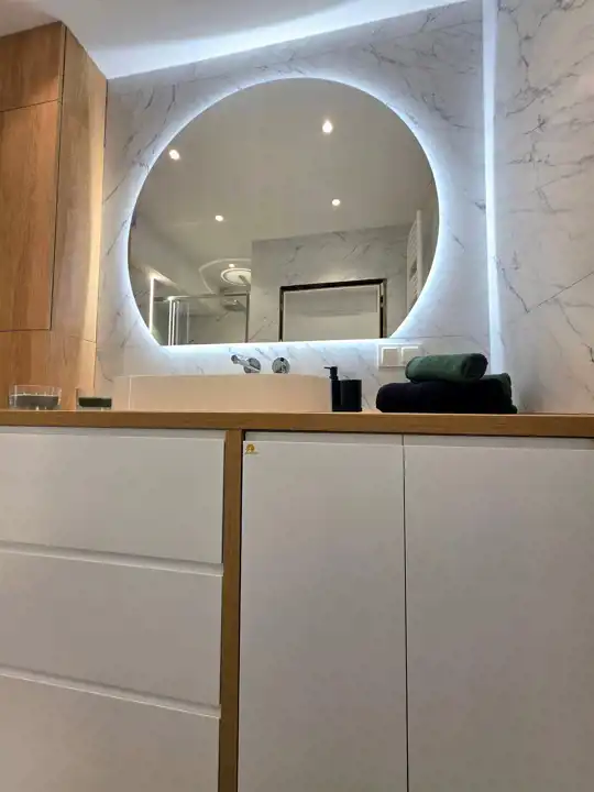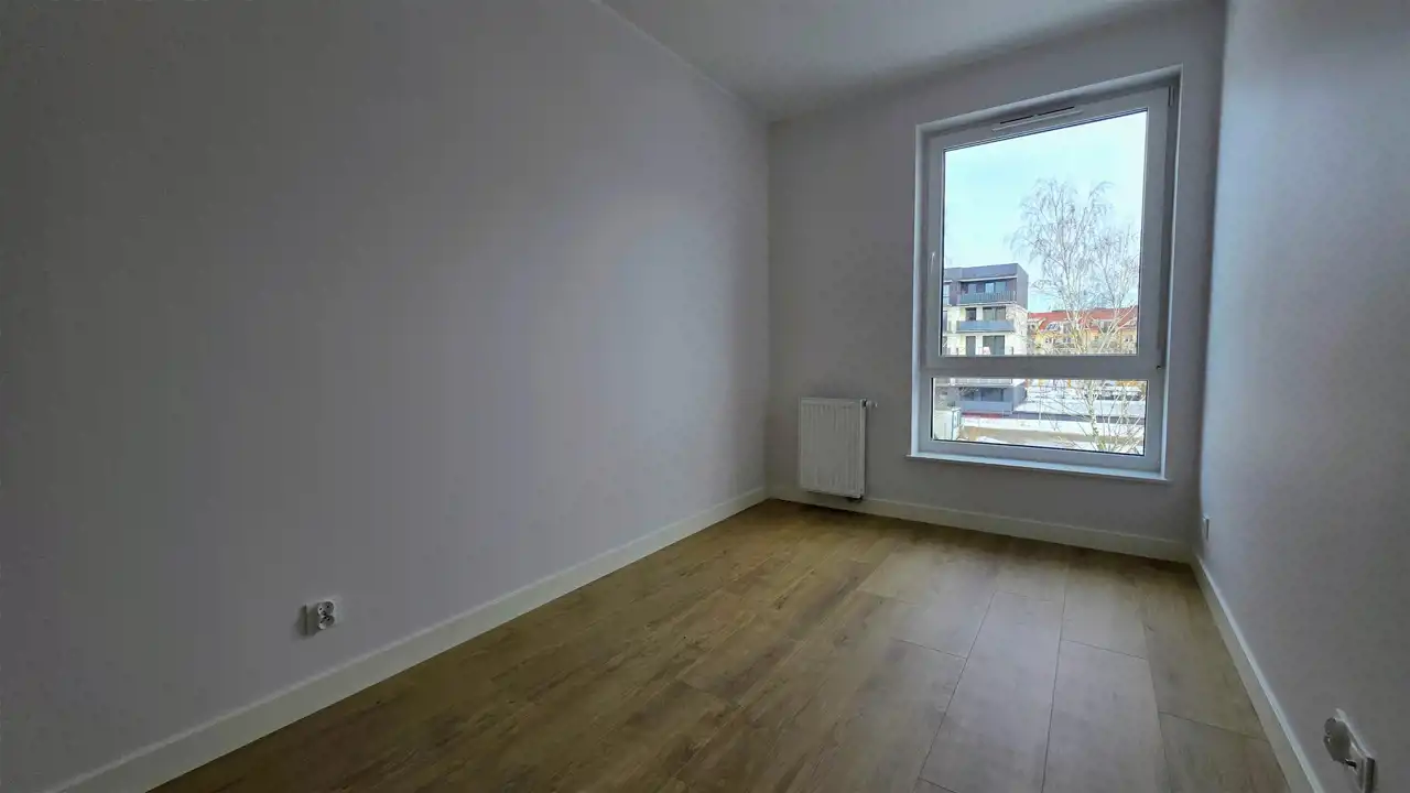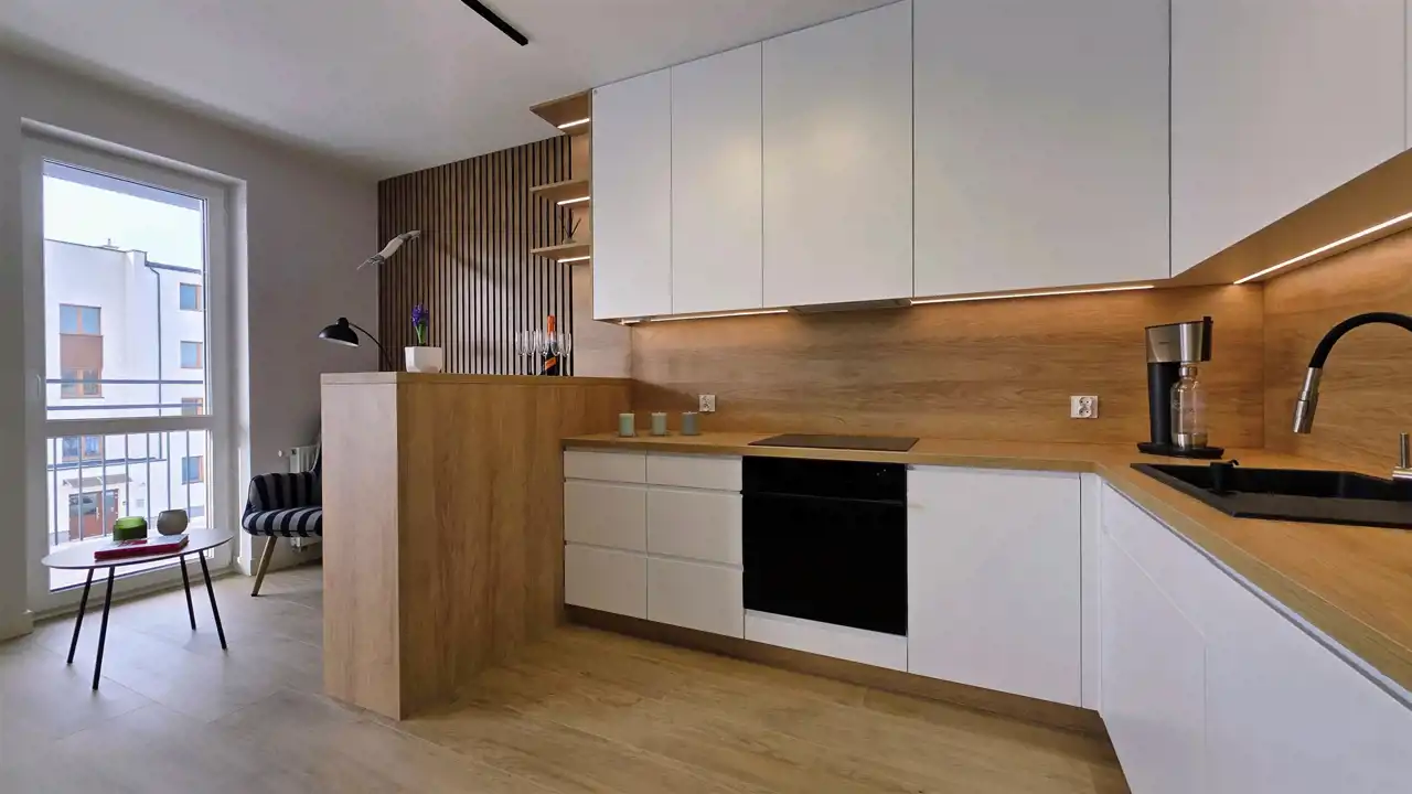 Mieszkanie zaprojektowane zostało z dużą starannością i daje poczucie świeżości i estetyki. Efektowna biała, lakierowana kuchnia z elementami drewna w zabudowie, które to nadaje ciepła wnętrzu. Została wyposażona w niezbędny sprzęt AGD: piekarnik elektryczny, pochłaniacz, płytę indukcyjną, zmywarkę (60cm) oraz lodówko zamrażarkę Ozdobą salonu na jednej ze ścian są zamontowane dekoracyjne lamele w kolorze dąb wotan, które posiadają dodatkowo właściwości akustyczne. Łazienkę wyposażono w efektowną, dużą kabinę prysznicową, wiszącą misę sedesową, pralkę Candy i szafki w zabudowie Charakter temu pomieszczeniu nadają też nowoczesne o dużym formacie jasne płytki i podświetlane lustro, które optycznie powiększa łazienkę. Dodatkowym atutem jest komfortowa, podgrzewana elektrycznie podłoga. Podłogi mieszkania zostały wyłożone jasnymi, wysokiej jakości panelami. Ściany w pokojach zostały pokryte gładzią i pomalowane jasnymi farbami. Na sufitach zastosowano emulsję antyrefleksyjną. Godnym uwagi jest sposób oświetlenia wnętrz, z wykorzystaniem list halogenowych, które pozwoliły na uzyskanie efektu przyjemnej i klimatycznej przestrzeni. W przedpokoju została zamontowano lakierowana dwudrzwiowa szafa w kolorze białym z siedziskiem. Pomieszczenia ogrzewane są kaloryferami wyposażonymi w termostaty. Na przestronnym balkonie został położony na dystansach, bezfugowo gres mrozoodporny na wpływ zróżnicowanych temperatur, wilgoć oraz oddziaływanie promieni UV.