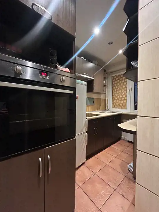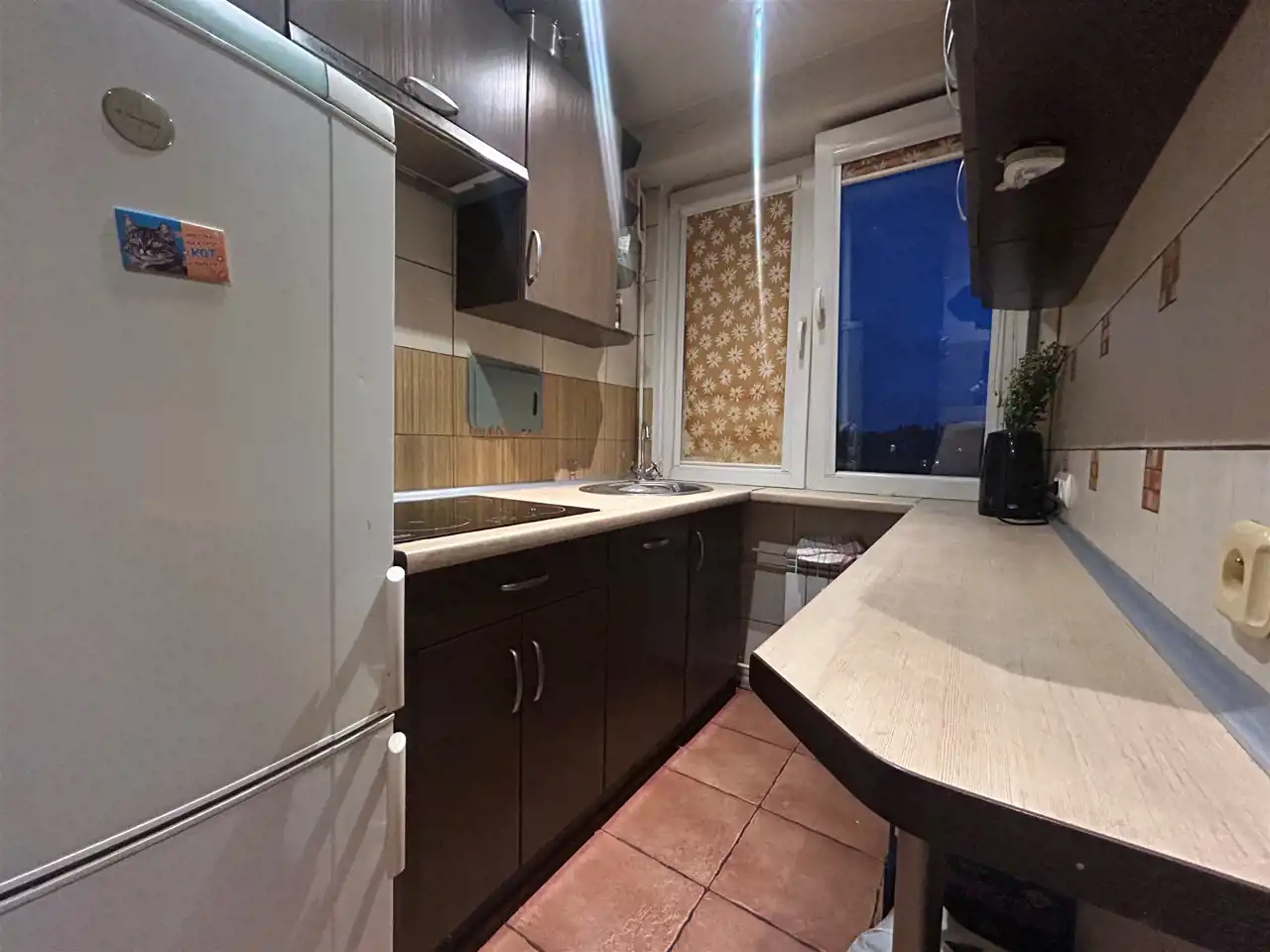 W mieszkaniu pozostaje całe widoczne wyposażenie, w tym umeblowana kuchnia z zabudową i sprzętem AGD.