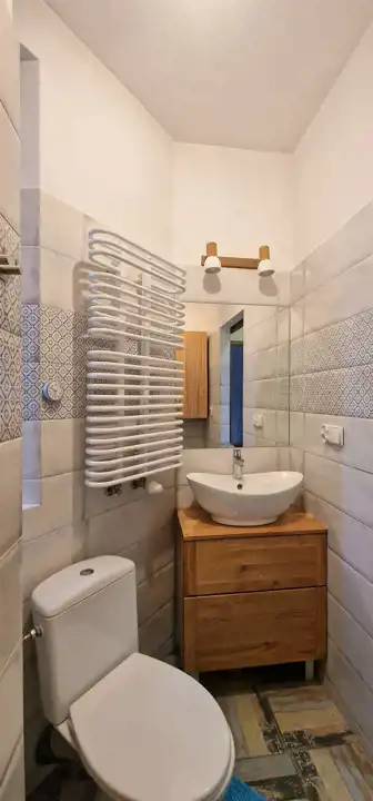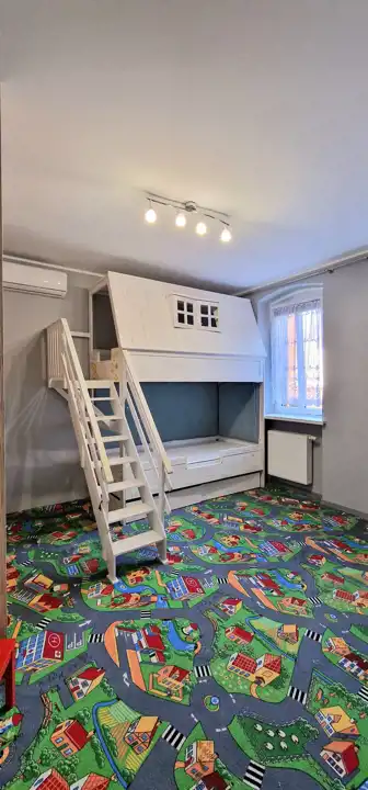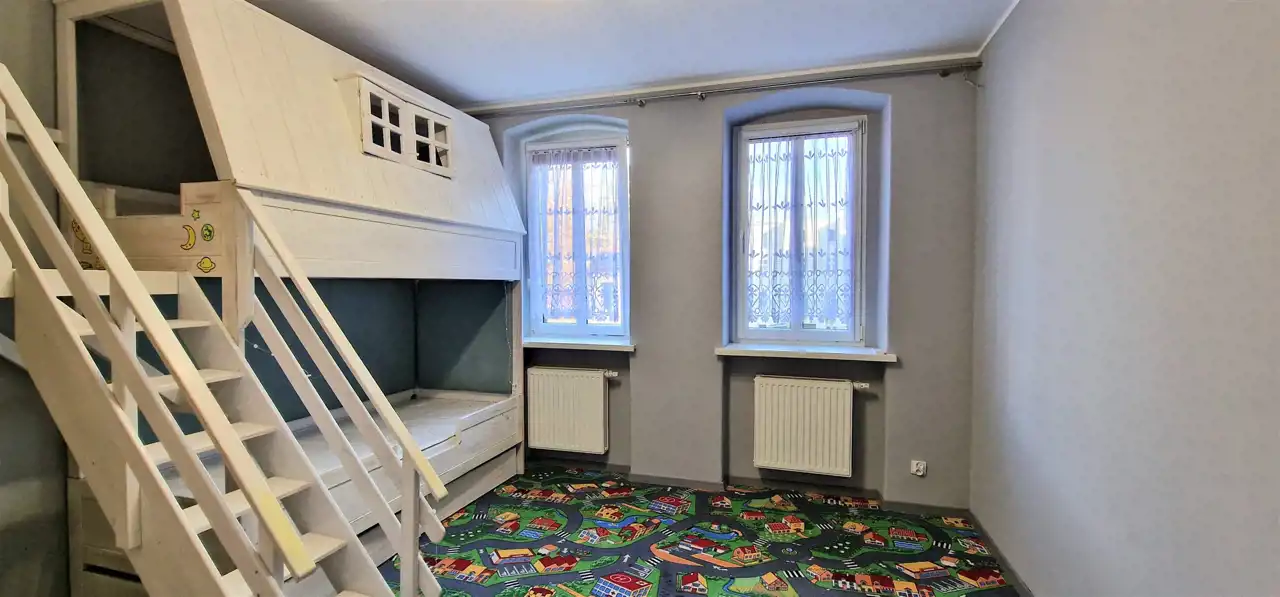 W pokoju, który do tej pory służył jako pokój dziecięcy, stoi łóżko piętrowe oraz pojemna szafa w zabudowie Może ono zostać zdemontowane. Łazienka wyposażona została w prysznic, wc oraz zlew z szafką.