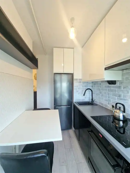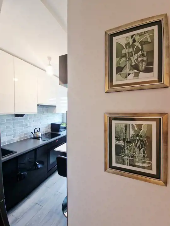 Kuchnia została wyposażona w nowoczesne meble w zabudowie, lakierowane w kolorze białym oraz czarnym, a także w nowoczesny sprzęt AGD firmy Amica: płytę indukcyjną, piekarnik elektryczny, mikrofalówkę, pochłaniacz oraz lodówkę. Na przeciwko zabudowy stanął stolik z dwoma hokerami.