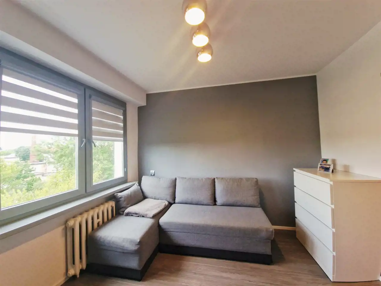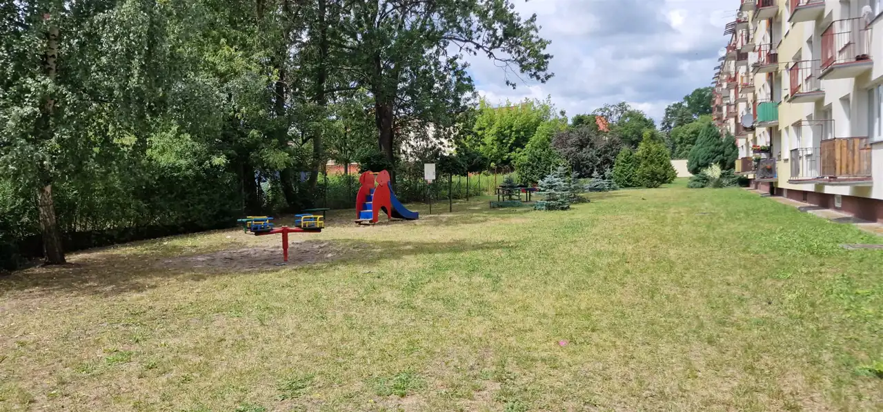 Mieszkanie jest ciepłe i słoneczne, z widokiem na plac zabaw i tereny zielone wokół bloku.