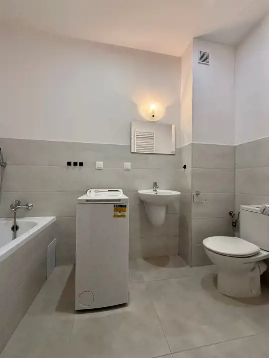 Aneks kuchenny jest już wyposażony w zabudowę, lodówkę oraz kuchenkę, co oznacza, że możesz od razu korzystać z kuchni bez inwestowania w sprzęt. W łazience znajdziesz wannę, pralkę oraz kompletną armaturę, co znacząco podnosi komfort codziennego życia.