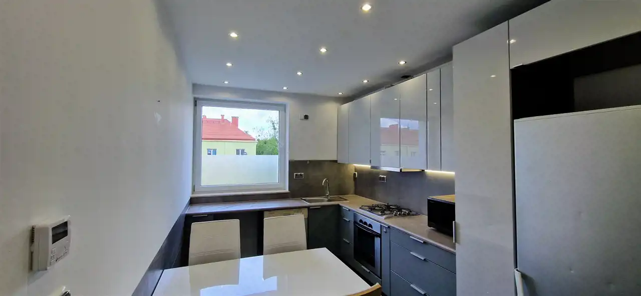Kuchnia została wyposażona w zabudowę kuchenną wraz ze sprzętem AGD: lodówko - zamrażarkę, płytę gazową, piekarnik elektryczny, zmywarkę, mikrofalówkę oraz okap. Salon został wyposażony w kanapę, stół z krzesłami oraz szafę typu Komandor. Nowoczesna łazienka została kompletnie wyposażona w kabinę prysznicową, pralkę, zlew z szafką, lustro oraz wc. Dużym atutem jest ogrzewanie podłogowe w całej nieruchomości z dodatkowym ustawieniem temperatury w każdym pomieszczeniu.