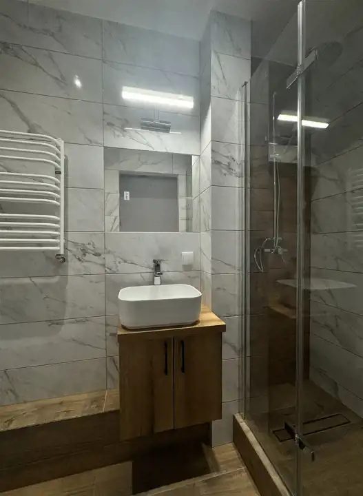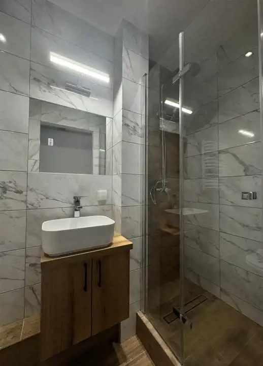Kuchnia wyposażona została w meble w zabudowie kuchennej oraz kuchenkę gazowo-elektryczną. Łazienka wraz z WC pokryta nowoczesnymi kaflami, została wyposażona w kabinę prysznicową z brodzikiem, szafkę wiszącą ze zlewem, wc oraz lustro. Do mieszkania przynależy piwnica.