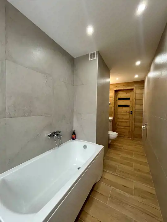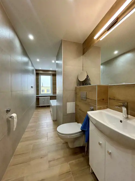 -duża, przestronna łazienka z toaletą, wanną i oknem