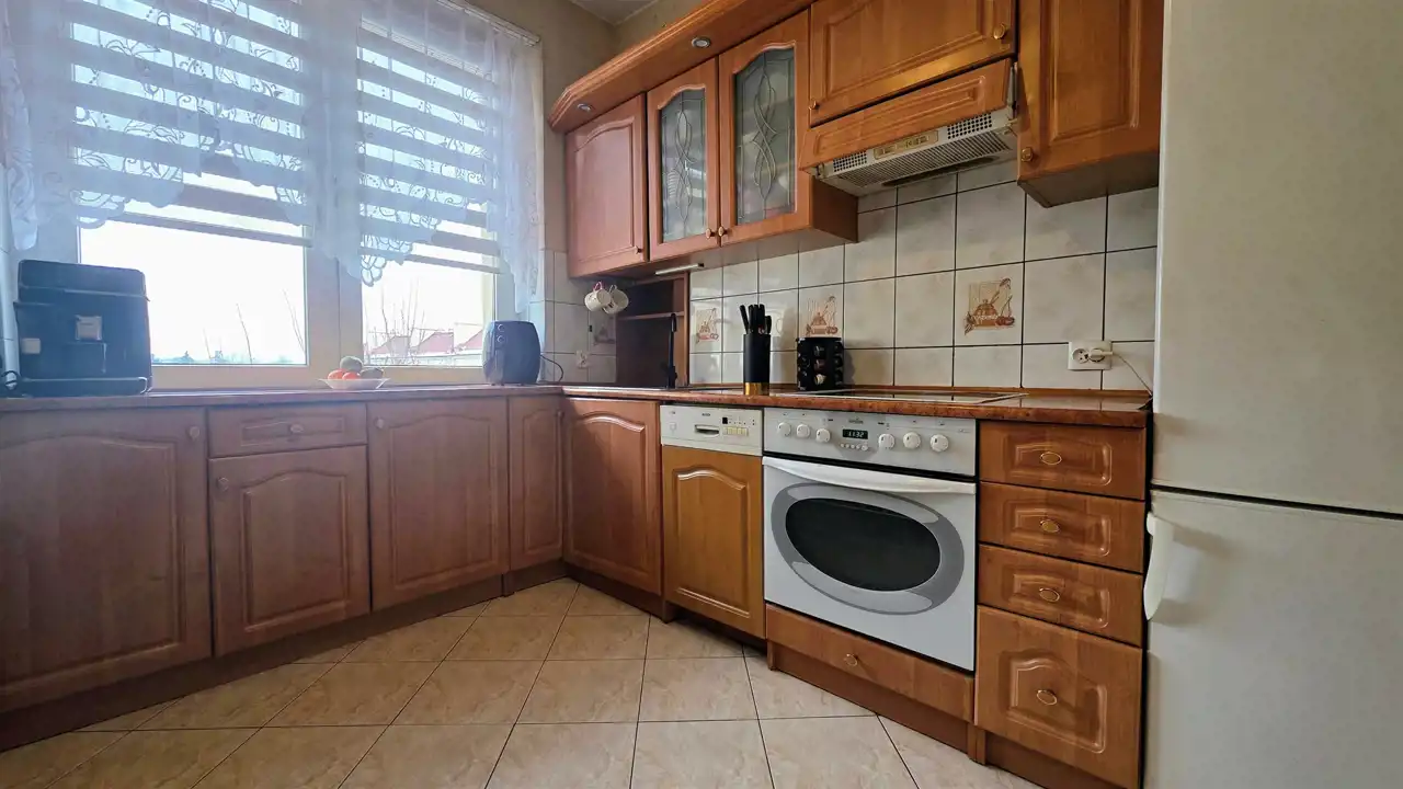 Ściany pokryto gładziami, które zostały pomalowane w jasnych kolorach, zaś na podłogach ułożono parkiet oraz gres. W trosce o bezpieczeństwo lokatorów zamontowano zewnętrzne drzwi antywłamaniowe oraz domofon. Łazienka wraz z WC urządzona została w kabinę prysznicową, umywalkę, szafkę wiszącą i lustro. W kuchni zamontowane zostały meble kuchenne w zabudowie ze sprzętem AGD: lodówko - zamrażarka, zmywarka Bosch, piekarnik elektryczny i płyta indukcyjna Amica, oraz okap. W sypialni oraz przedpokoju znajdują się szafy typu Komandor.
