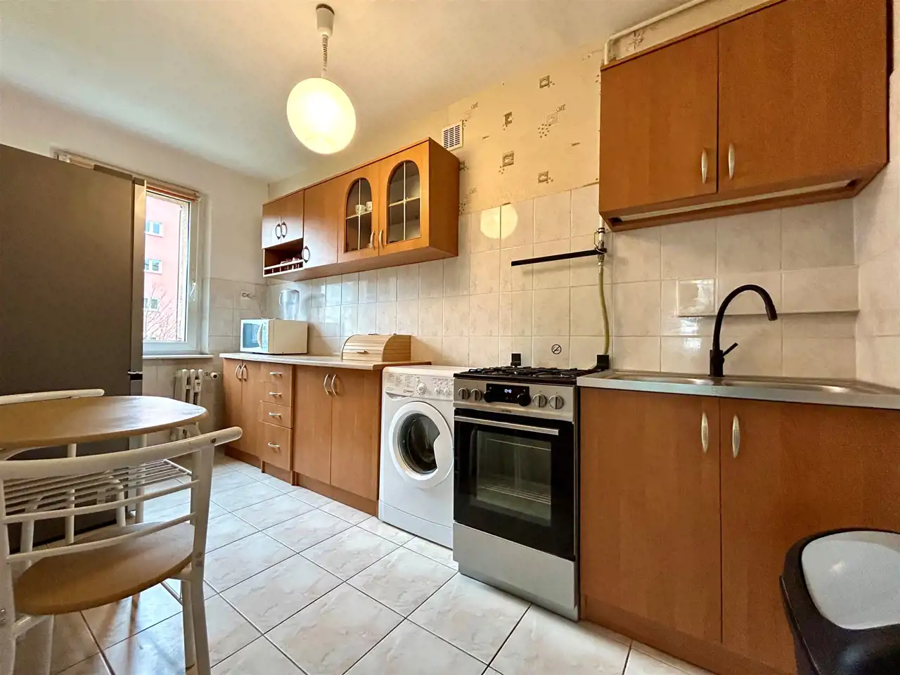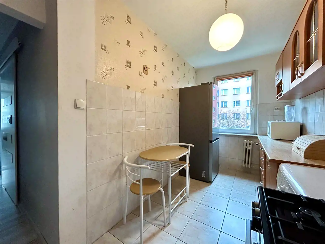 Osobna kuchnia z oknem to duży atut mieszkania. Jest jasna, funkcjonalna i w pełni wyposażona w meble kuchenne oraz sprzęty AGD: kuchenkę gazową, lodówkę, pralkę oraz mikrofalówkę. Do dyspozycji najemcy pozostają również naczynia, sztućce, talerze, kubki i szklanki, dzięki czemu można wprowadzić się bez konieczności kompletowania wyposażenia.